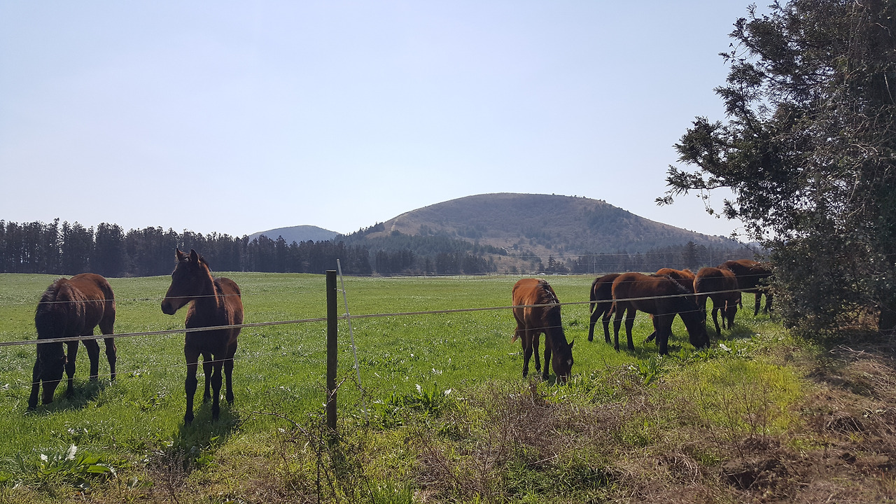 테쉬폰을 넘어 내려가 보니 방목지에서 말들이 한가롭게 풀을 뜯고 있었다. 말들을 좀 더 가까이서 찍고 싶었으나, 멀리서만 서성이고 있을 뿐이었다. 말들이 다가오기를 기다리는 것 외에 다른 방도는 없었다. 사진은 기다림의 미학이라 했나, 한참을 기다리다보니 말들이 조금씩 조금씩 풀을 뜯으러 사이좋게 다가와 주었다. 말들 뒤로는 오름이 있고, 목초지는 봄을 맞아 슬슬 푸른 빛을 내뿜기 시작하였다. 오름과 풀과 말, 참으로 목가적인 풍경이 만들어졌다.