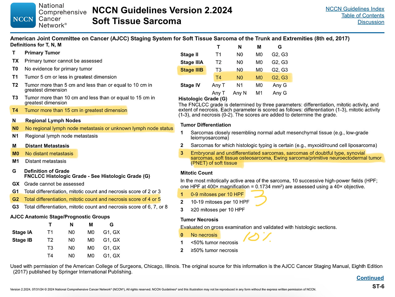 그 pdf 파일을 살펴보면, Sarcoma연구를 많이 한 전세계 유명한 교수들 이름이 패널로 등록되어 있었고, 패널들이 정보를 꾸준히 업데이트한다. 내가 했던 또는 하게될 수술, 방사선 치료 그리고 항암치료에 매우 자세히 기술되어 있었으며, 의사 선생님들께서 설명해주신 대부분의 내용이 여기 담겨 있었다. 또한, 나의 치료방향과 이 문서에서 가이드하는 치료방향과 정확하게 일치하기에 안심이 되었다. 다음의 이미지들은 나의 기수를 산정하는 기준이나 항암약을 선택하는 기준 정보를 하이라이트 하였다.