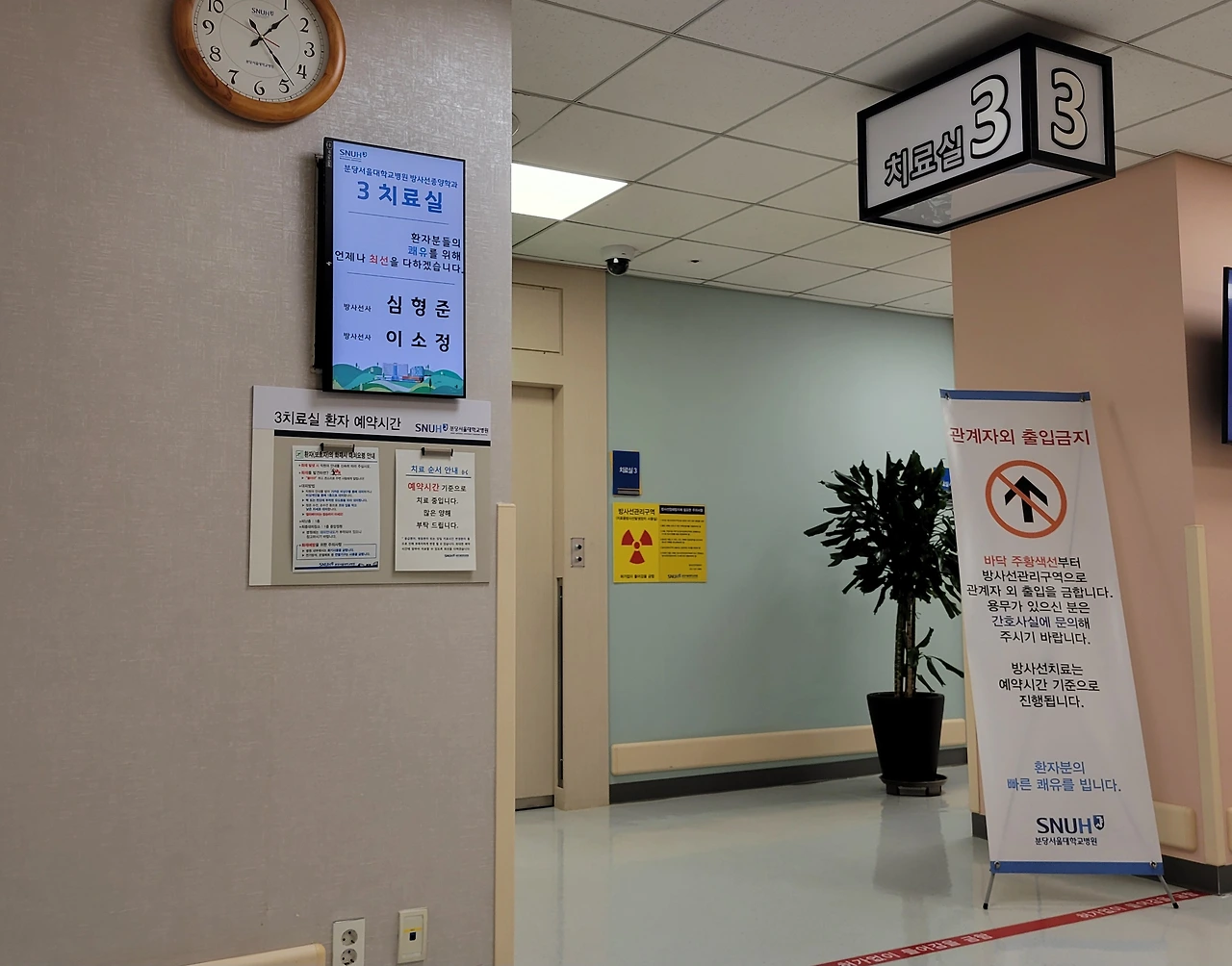 방사선은 매일 같은 시간에 병원을 방문한다. 접수를 하고, 환복을 하고, 담당 방사선실 앞에 앉아 있다가 호명하면 방사선 실에 들어가면 된다. 분당서울대병원은 총 4개의 방사선실이 있고, 나는 제3 방사선실에서만 매일 치료를 받는다. 환자마다 몸을 고정해주는 장치들이 필요한데, 각각 마다 모양이 틀리고 부피가 크다. 이에 각 방사선실마다 담당 환자의 장치들을 보관하고 있어서 같은 방사선실에 들어가야 혼선을 줄일 수 있을거라 생각된다. 아니면, 각 방사선실마다 다른 방사선 기계가 설비되어 있어 방을 바꿀 수 없을 수도 있다.