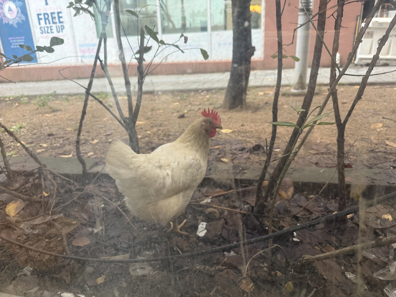 창밖으로 닭 한 마리가 보였다.