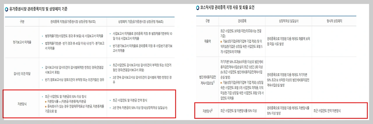 코스피, 코스닥 시장 모두 상장 회사의 상장 폐지 요건으로 자본잠식 요건을 두고 있는데
