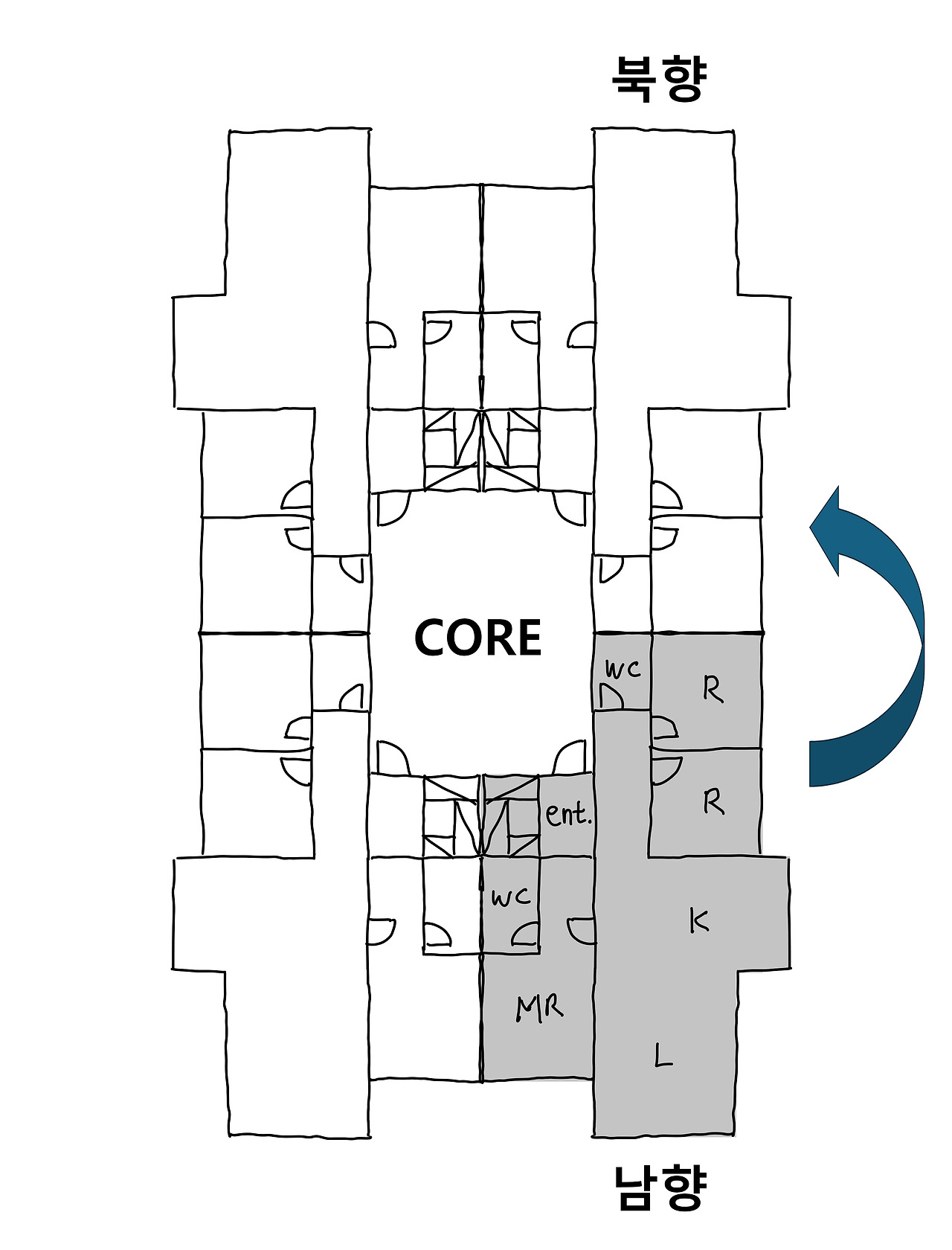 그런데, 이 아파트를 설계한 건축가는 - 시공사도 동의했겠지만 - 타워형 4호 조합을 설계하면서 남쪽의 유닛을 그대로 미러(mirror)해서 북쪽에 배치하는 무심함을 드러냈다. 미러(MIRROR) 했다는 것은 남향 단위세대를 뒤집어서 그대로 북쪽에 놓았기 때문에 북향 단위세대를 만들었다는 얘기다. 남쪽 유닛의 거실전면은 남향과 조망을 누리겠지만, 북쪽에 배치된 유닛의 거실은 북향과 도로의 소음에 시달릴 것이 뻔한 일이다.