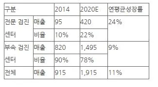 - 중국 검진시장은 2014년 915억 위안 (약 한화 17조)에서 2020년 21,915억 위안 (35.7조)으로 성장할 것으로 예측. 2014년의 경우 전문 검진센터의 매출 비중은 전체의 10%에 불과하나, 향후 빠르게 성장해 2020년에는 매출의 22%를 차지할 것으로 예측