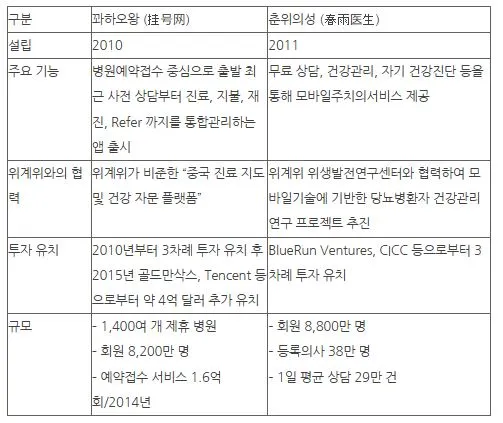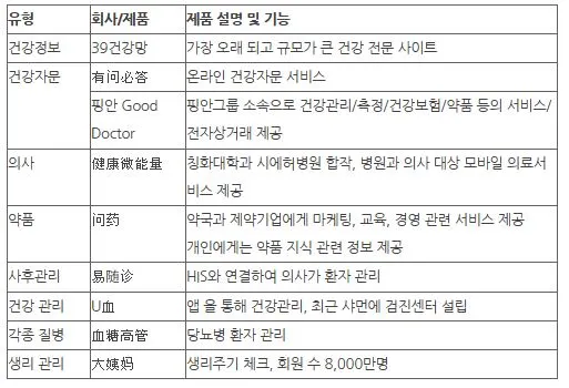 중국 모바일 의료시장의 발전에 따라 최근 특정 타깃, 특정 기간, 특정 질병 중심의 앱을 중심으로 한 온라인 의료서비스가 증가하고 있음. 일부는 웨어러블 기기와 결합된 앱을 제공하기도 함