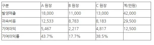 발생매출에서 귀속비용을 뺀 기여이익을 산출하고, 총 기여이익에서 각 원장별로 기여이익률을 산출하도록 한다.