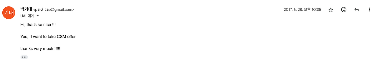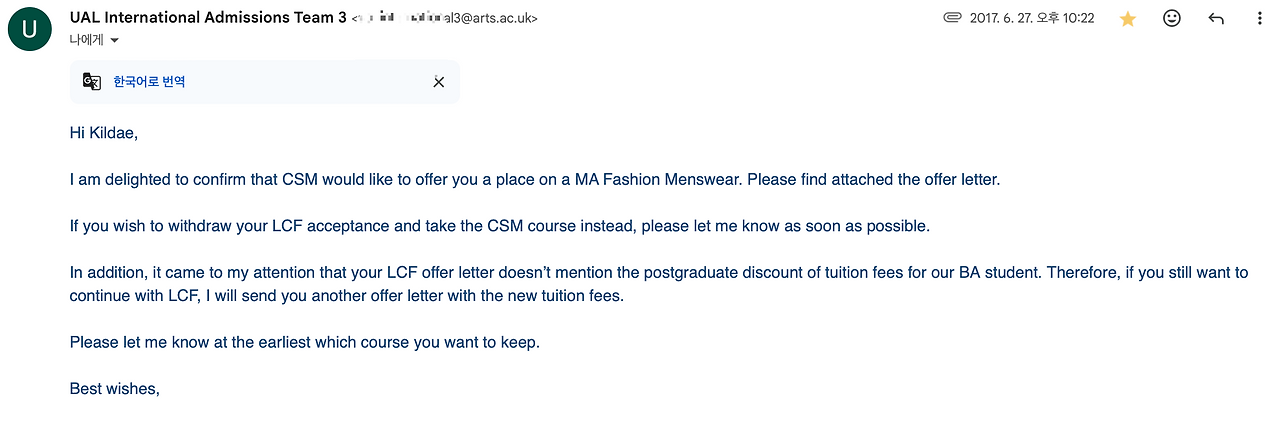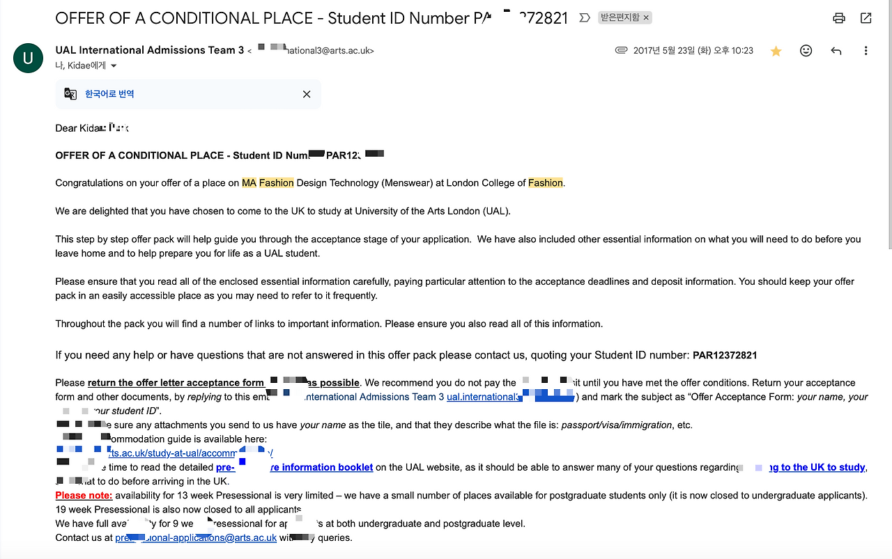 다행인진 몰라도 LCF의 석사과정의 오퍼를 먼저 받았다. 하지만 CSM이 아니면 패션을 더 공부할 필요가 없다고 생각했다. 아직 집에는 LCF의 합격 소식을 알리지 않았다. Old street(올드스리트) 역 주변 사설 기숙사에 살고 있었던 나는 방에만 있기 답답해 기숙사 건너편 스타벅스에서 작업을 하곤 하였다. 그날도 작업을 하다가 이메일을 확인하는 도중 CSM에서 온 메일을 발견하였다. 떨리는 마음으로 열어보았다. 합격 메일이었다. 앞으로 입학하려면 어떻게 해야 하는지 적혀있었다. 눈물이 흘렀다. 영국 휴학을 처음 결정한 계기가 Alexsander Macqueen(알렉산더 맥퀸)이 좋았고 그가 공부한 곳에서 학습하고 싶다는 생각으로 영국에 왔는데, 드디어 그가 졸업한 학교의 같은 학과에 입학 오퍼를 받게 되었다. 기쁨의 눈물이었다.