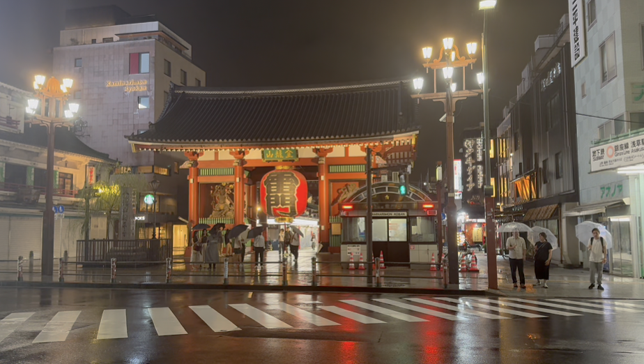 우선, 지하철을 타고 아사쿠사로 떠났다. 아사쿠사역으로 나와 바로 졸 수 있는 정문은 환하게 밝혀져 있어서 금방 찾을 수 있었다. 일본의 신사를 싫어하는 사람들도 많지만 그냥 의미 없이 야경을 보러 간다면 추천한다. 낮때와는 다르게 사람도 적고 곳곳에 조명이 켜져 있어 다른 매력을 느낄 수 있었다. 게다가 비 까지 온 뒤라서 더 좋았던 것 같다. 아사쿠사의 계단에 앉아 한참을 쉬었는데 야경도 예쁘고 빗소리도 좋고, 무엇보다도 많이 걸었음에도 다리가 아프지 않아 다행이라고 생각했다.