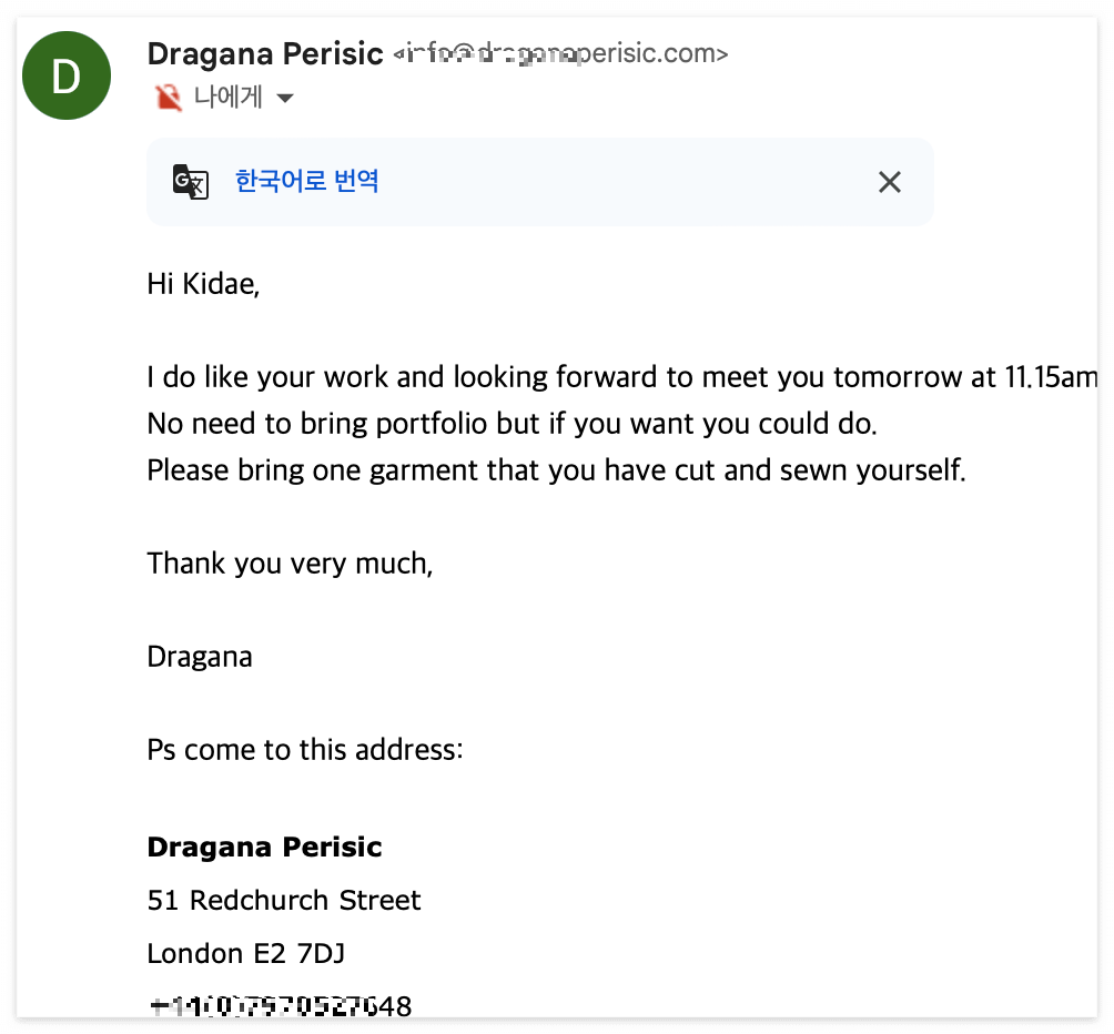그러던 중 한 군데에서 연락이 왔다. 쇼디치의 한 작은 여성복 개인 브랜드였다. 디자이너는 내가 작업한 옷이 보고 싶다고 면접날 가져오라고 했다. 중년의 여성 디자이너는 내가 다른 학생들보다 봉재를 잘한다고 칭찬해 주었다. 그리고 나는 이곳에서 영국에서의 첫 인턴쉽을 시작하게 되었다. 이곳이 앞서 언급한Dragana Perisic이다. 참고로 쇼디치는 올드스트리트는 자유롭고 힙한 분위기로 다양한 편집숍, 빈티지숍 등 유명 브랜드들이 모여있는 곳이다. 학교가 끝나면 이곳의 옷가게들을 돌면서 새로운 시즌의 옷을 구경하며 옷의 구조와 만드는 방법을 연구하곤 했던 기억이 난다.