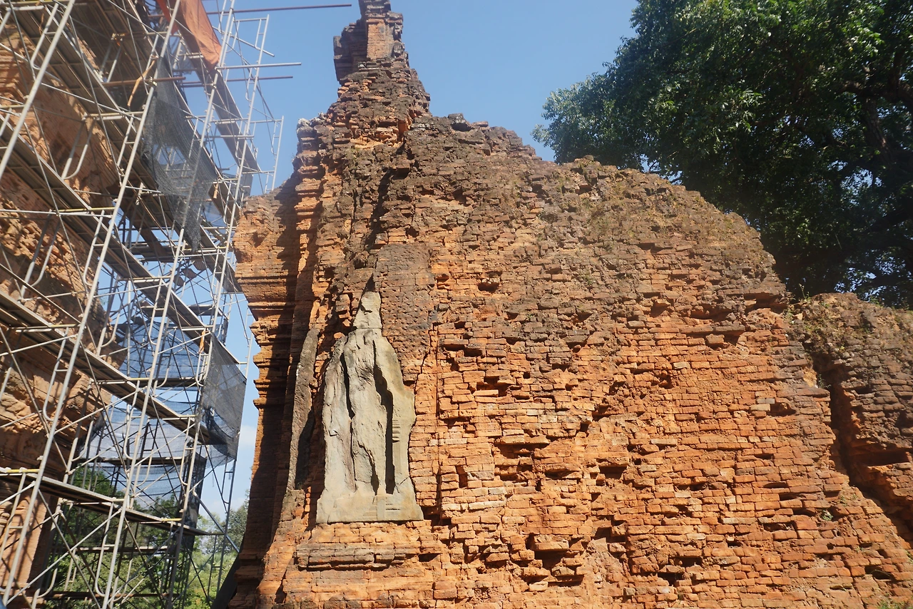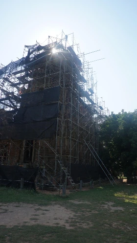 롤레이는 후대의 앙코르와트와 달리 벽돌로 짓고 외장은 회반죽으로 바르고 그 위에 조각을 했던 것 같은데 이제는 벽돌만 앙상하게 보이고 그 화려했던 흔적은 보이지 않았다. 지금은 비계를 이용하여 보수에 한창이다.