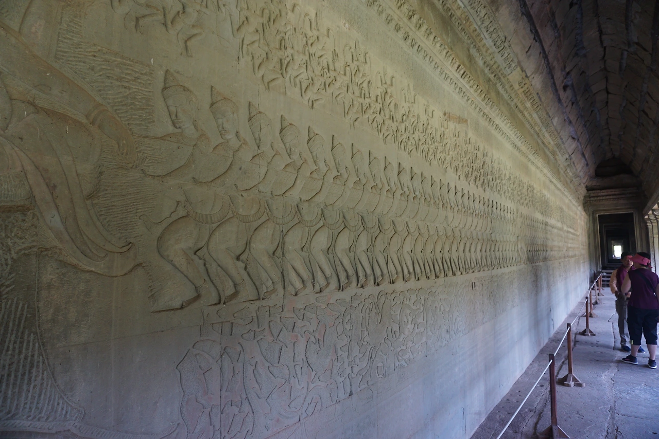 우리는 중앙 참배로 를 따라서 사원으로 향하다가 가이드의 안내를 받아 오늘 아침 일찍 다녀온 바 있는 북쪽 연못으로 방향을 돌렸다. 북쪽 연못가에는 일출 포토존도 되지만 낮에는 매점도 있고 각종 옷가게도 즐비했다. 가이드가 우리에게 코코넛을 시음해주고 싶었던 모양이다. 1달러 하는 코코넛을 먹는 둥 마는 둥 하여 가이드가 혹시 섭섭했을지도 모른다. 나는 마음이 급했는데 우리 가이드는 마음이 느긋한 것 같았다. 가이드의 해설을 다 들으려면 과연 오늘 일정을 순주롭게 마칠 수 있을까 하는 의문이 들었다. 나는 마음속으로 대충 일정을 확인하면서 가이드에게 "씻완 선생님. 앙코르와트 1층에 약 800미터 길이의 부조물에 대해서는 간략하게 이야기해주시면 감사하겠습니다. 시간이 좀 없어서..." 말했는데 가이드는 8개 테마로 나뉜 부조 중에 스펙터클한 수리야바르만 2세의 승리 전쟁 이야기와 우유 바다 휘젓기 등만 설명하고 바로 2층 회랑으로 올라왔다. 많을 것을 해설하고 싶었던 가이드 선생은 다소 풀이 죽은 모습이었다.