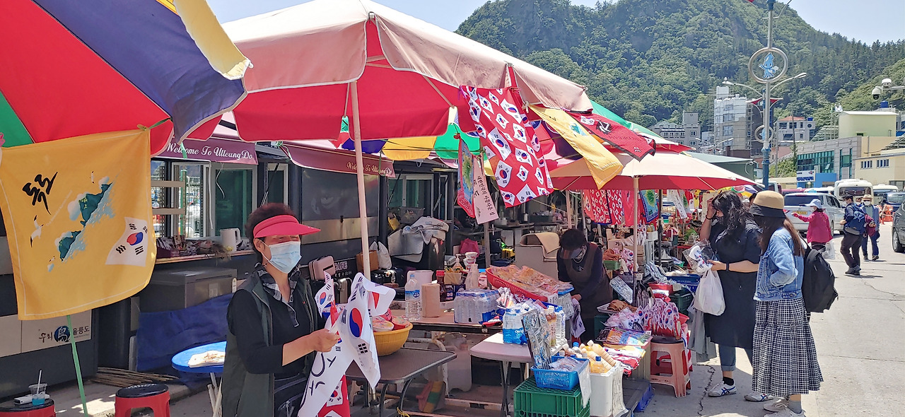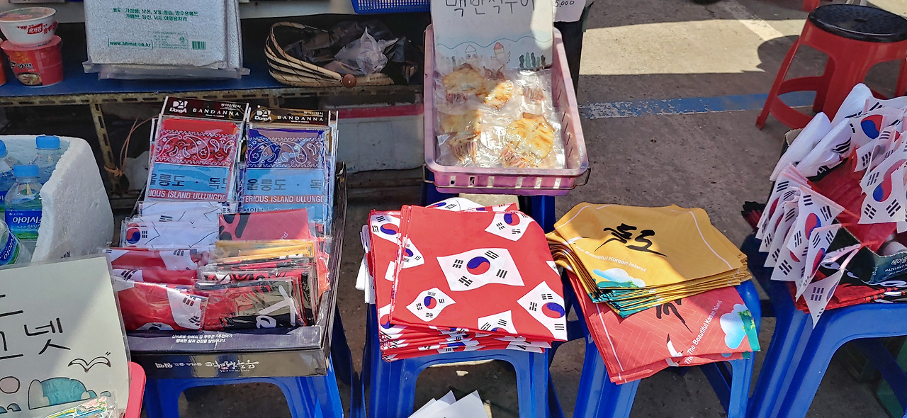 출발전 많은 여행객들이 태극기와 태극기가 그려진 머플러를 사고 있다. 독도입도하면 대한민국 국민으로서 태극기를 멋지고 흔들고 싶은 것이다. 우리부부도 2개(1개당 1천원) 구입하였다.