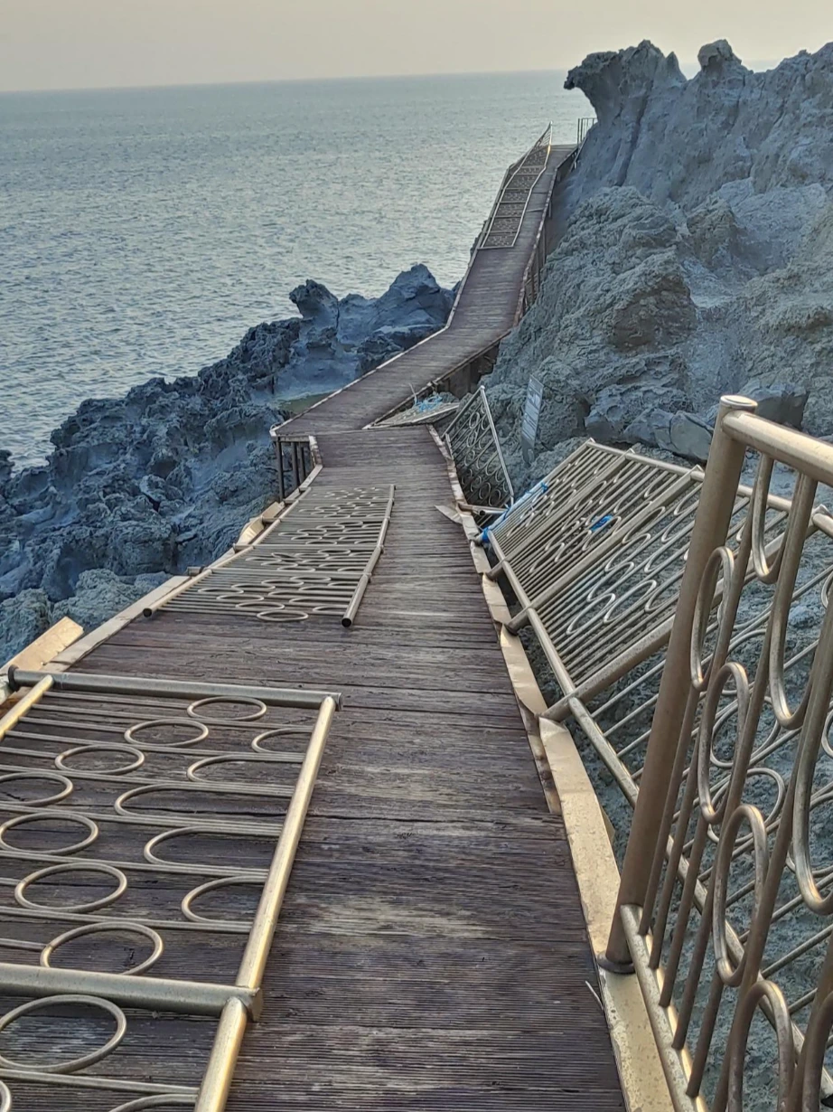'태하 해안산책로가 지난 태풍의 여파로 펜스가 어지럽게 부서져 있다. 마침 거세게 부는 바닷바람으로 인하여 산책을 중단했다.