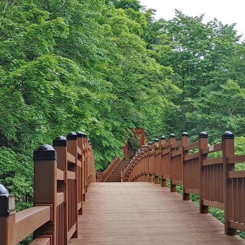 올라가는 등산길이 완만하여 다소 지루하게 느껴질 수 있는데 테크 형태의 구름다리와 출렁다리를 만들어놓아 잠시 휴식도 취하고 사진도 찍었다.