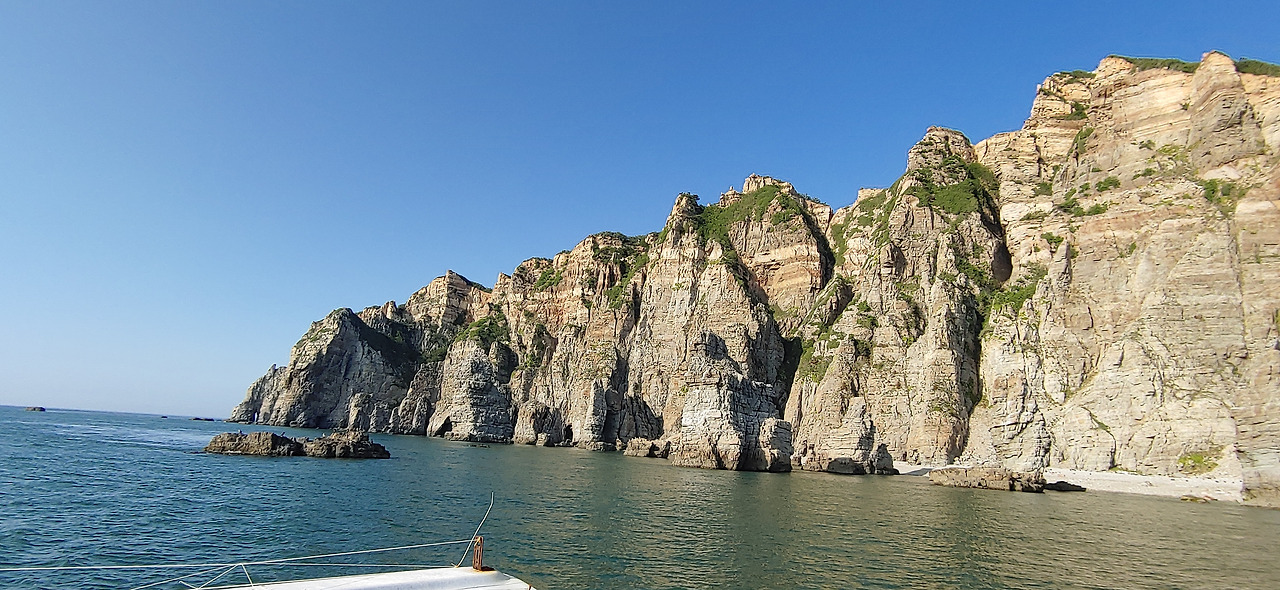 우리는 17:00경 두무진 해상관람을 시작했다. 유람선을 타고 약 45분이 소요된다. 백령도 관광의 필수코스로서 최고의 비경인 두무진은 장엄한 해안절벽과 기암괴석을 감상할 수 있는 해상관람길이다. 기암박물관이라도 불리어도 부족하지 않을 정도로 자연이 만든 독특한 바위들이 늘어서 있으며 거친 파도 앞에서 위풍당당하게 솟은 기암절벽을 감상할 수 있다. 코끼리바위, 신선대, 선대바위, 형제바위 등 온갖 모양의 바위가 바다를 향해 늘어서 있다(09 두무 비경길 안내문 인용). 선장님이 출발과 함께 유머스럽게 재미있게 설명해 주는데 사진 찍기를 좋아하는 나는 선미에 서서 끝없이 펼쳐지는 풍광을 쉼 없이 사진셔터를 누르고 있었고 아내는 선내에서 편안하게 앉아서 선장님의 해설을 꼼꼼하게 들으며 창밖의 멋진 절경을 눈에 담고 있는 모습이다.