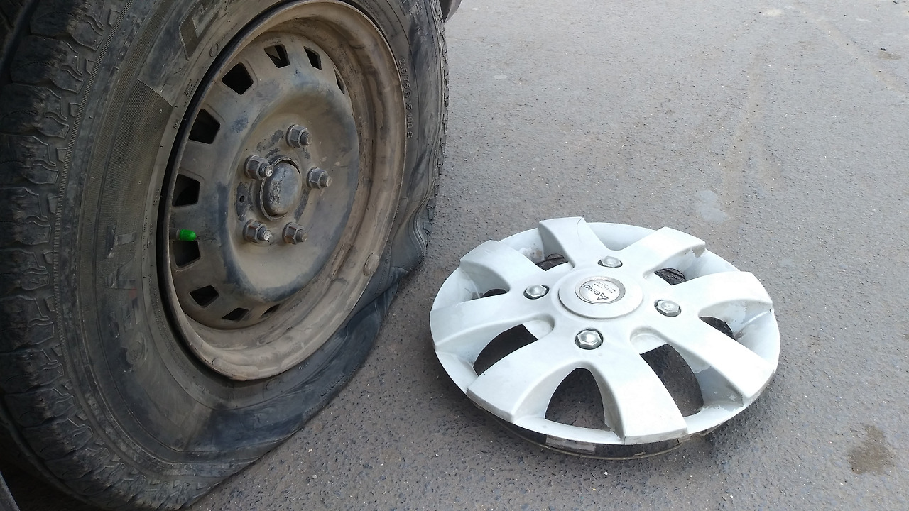 일을 마친 후 돌아와 자동차에 시동을 켜고 이동하려는데 휘청하며 덜컹거리는 소리가 났다. 내려서 살펴보니 자동차의 앞바퀴 하나가 펑크가 났는지 완전히 납작해져 버렸다. 순간, 지난날의 기억이 오버랩되어 남편과 나는 마주 보고 웃었다. 아무 말할 수 없었다.