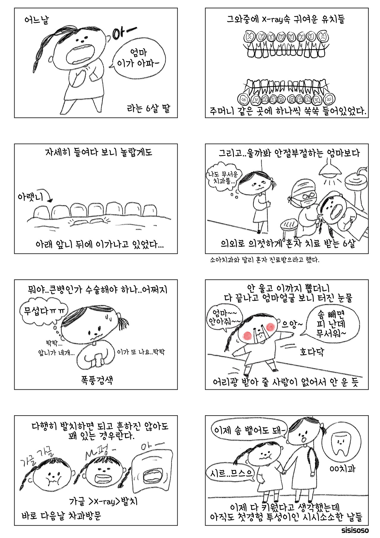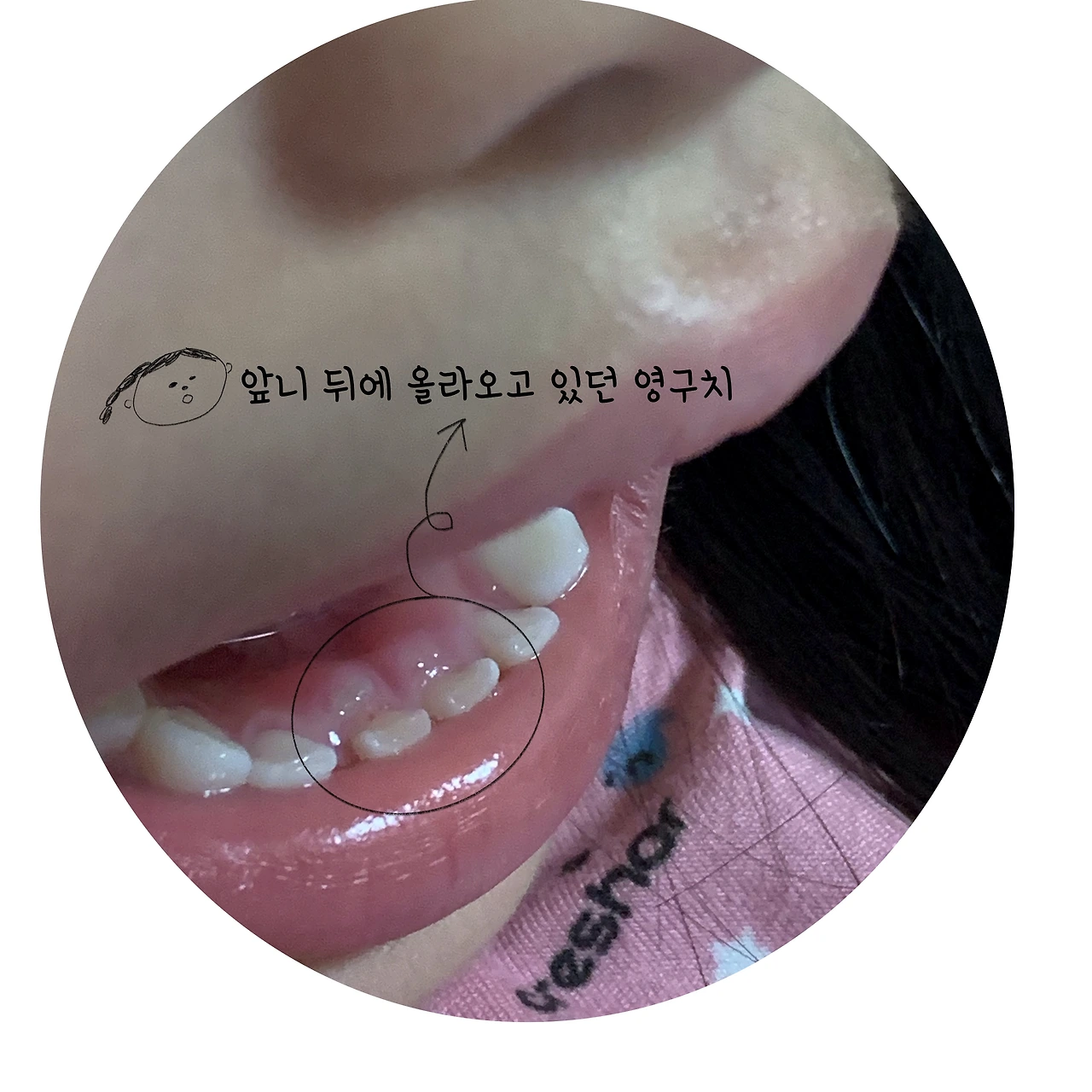 앞니 뒤 잇몸에서 하얗게 보이는게 미리 올라오는 영구치. 유치가 많이 흔들리고 있다면 두고 볼 만도 한데 아주 미세하게 흔들려서 부분 마취 후 발치했다. 비용은 9천원^^