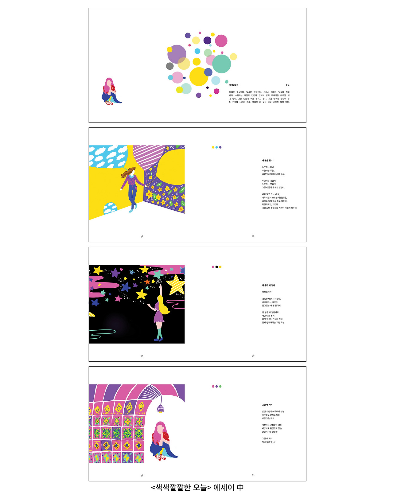 석사 과정 때 일러스트레이션 수업을 들은 적이 있다. 서비스전공 수업이 아니었는데, 일러스트에 관심이 많아 타전공과목을 듣게 되었다. 매주 자신만의 작품을 작업하며 교수님과 작품에 대해 이야기 나눌 수 있었다. 이 수업이 일러스트 작품 활동에 있어 많은 도움이 되었다. 교수님께서 주시는 따뜻한 격려도 좋았지만, 참고하라고 넌지시 말해주시는 피드백이 너무 소중했다. 과제 결과물로 한 학기 동안 그렸던 작품을 그 작품에 대한 글과 함께 엮어 에세이 책자를 만들었다. 만약 글로 기록을 남기지 않았다면, 그때 내가 느낀 감정이나 생각들을 오롯이 내가 간직할 수 있었을까. 기록의 중요함에 대해 다시 생각해 보게 된다.