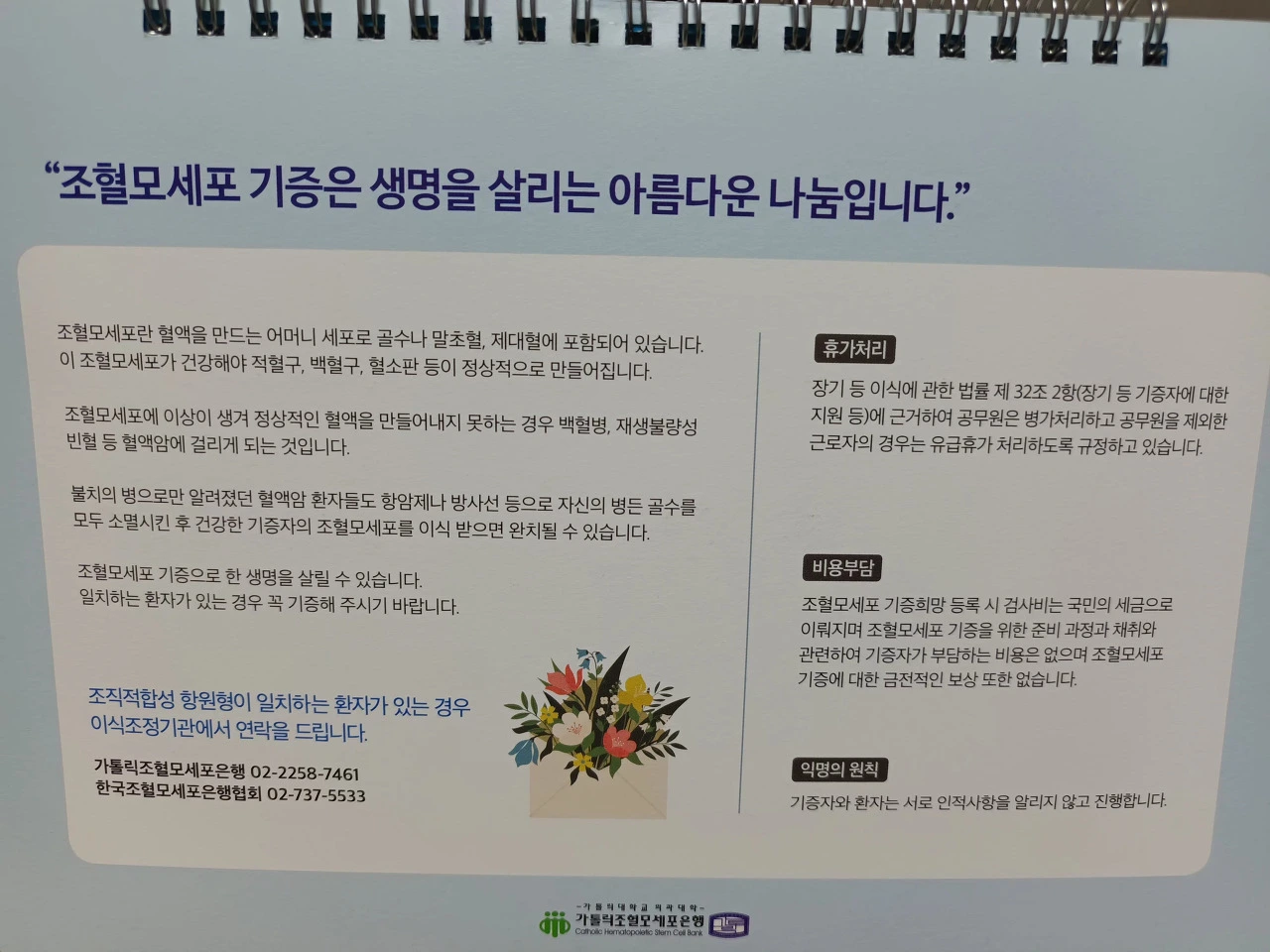 탁상달력을 받고 아들과 통화한 후 검색을 해봤다. 아들 말대로 별거 아닌 것은 아니지만 기증신청해 놓은 혈액이 백혈병과 같은 혈액암 환자들과 맞을 확률이 너무 낮아서, 미리 걱정할 필요가 없어 보였다. 나도 무심하게 해마다 연말이면 집으로 찾아오는 탁상달력을 받았다. 그렇게 5년이 흘렀다.
