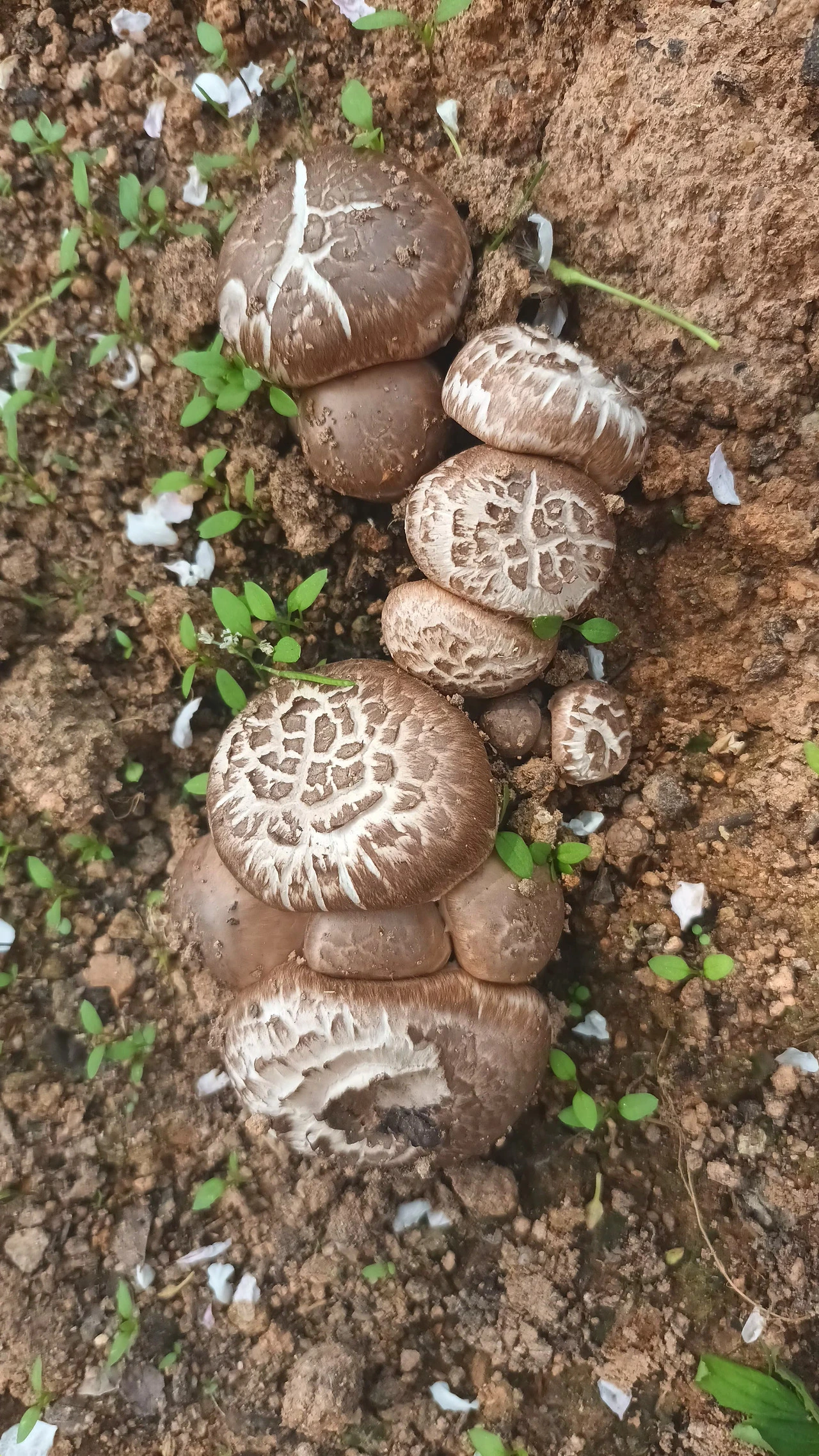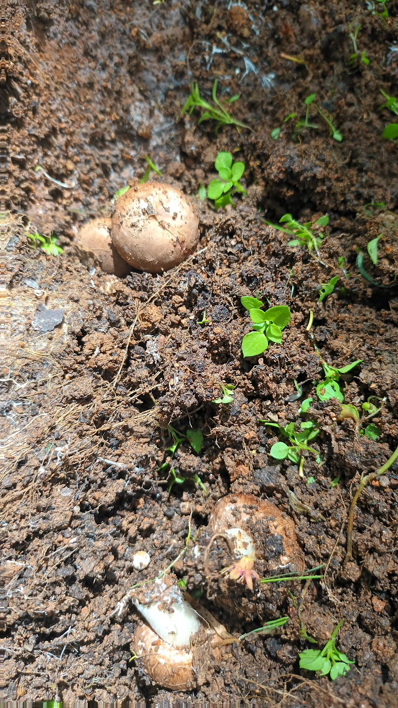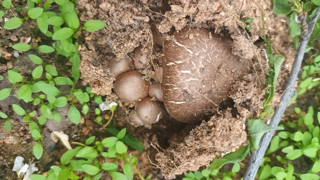 우리가 이곳에 정착한 지 8년 차이지만 이렇게 많은 버섯이 피어나는 광경은 처음이었다. 그렇다면 작년 4월 말에 들여온 거름이 가장 유력한 원인이었다. 거름 대여섯 포대 부어 골고루 쇠스랑으로 펴서 네 개의 두둑을 만들고 두 군데만 비닐을 씌웠었다. 그런데 비닐을 걷어낸 자리에만 버섯이 올라오는 것으로 보아 일 년여 동안 비닐 안에서는 적정 온도와 습도를 만난 균사체가 서서히 발을 넓혀가고 있었던 것이다.