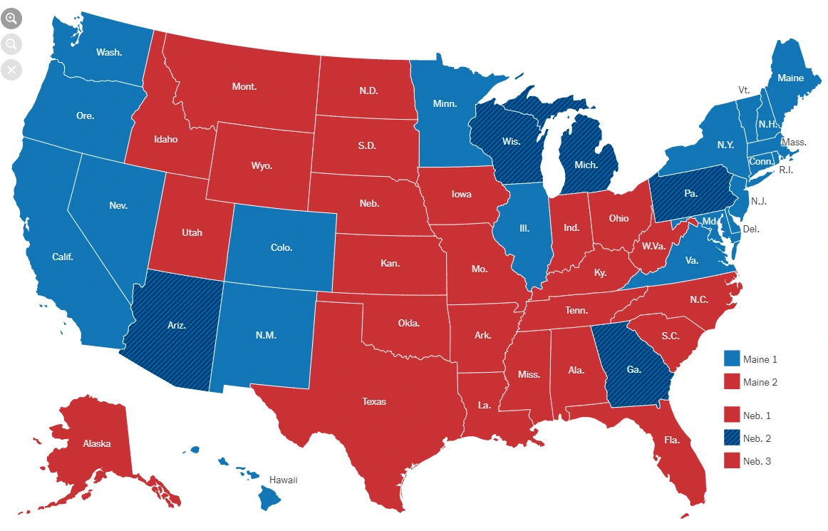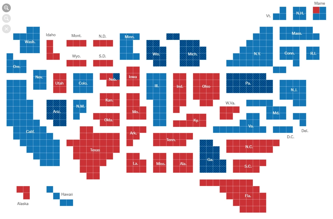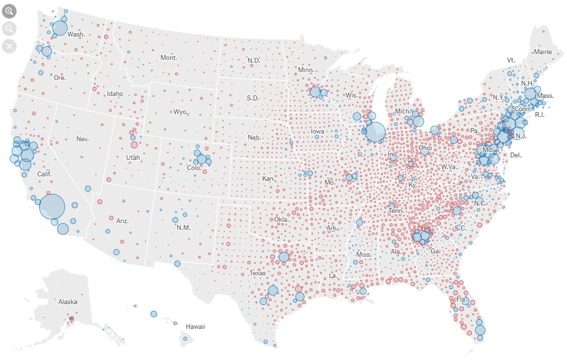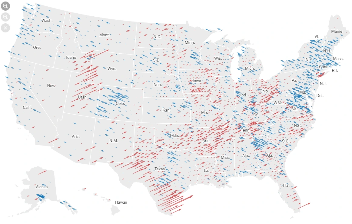 우선, 뉴욕타임즈는 개표 상황을 확인할 수 있는 선택지를 다양하게 제공하였다. 위와 같은 면적기반지도, 카토그램, 버블차트, 화살표지도가 바로 그 예이다. 시각화에 정답은 없지만, 독자로 하여금 다양한 시각화를 확인하며 하나만 보았을 때 생길 수 있는 왜곡을 최소화하게 도와주었다는 점에서 높이 평가한다.