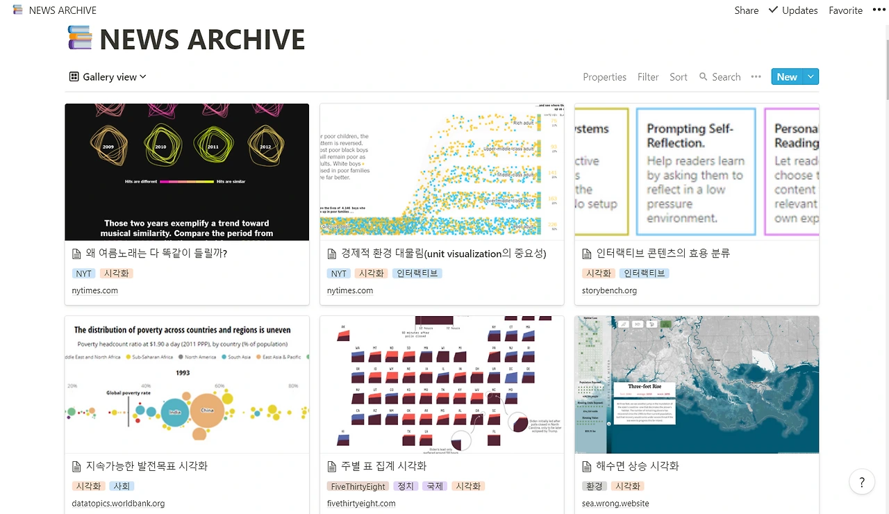 마부작침에서 인턴을 하며 가장 좋아했던 회의는 다름 아닌 레퍼런스 회의였다. 심심하면 데이터 시각화 콘텐츠를 찾아 노션에 쌓아두곤 했는데, 팀원들과 각자 찾아본 매주 국내외 데이터 저널리즘 콘텐츠를 공유하고 스토리텔링, 데이터 수집, 분석 방법론 등의 측면에서 의미있는 인사이트를 나눌 수 있어 굉장히 즐거운 시간이었다.