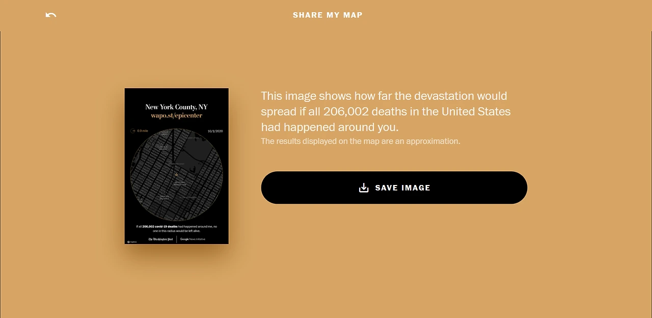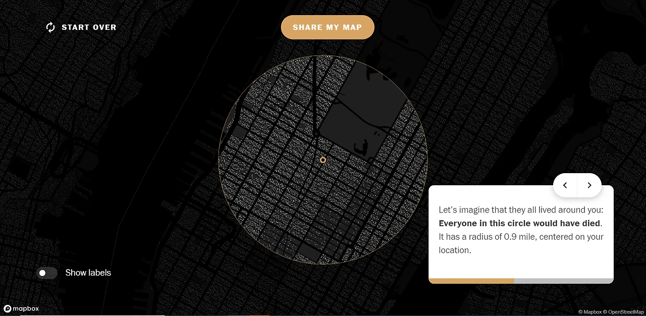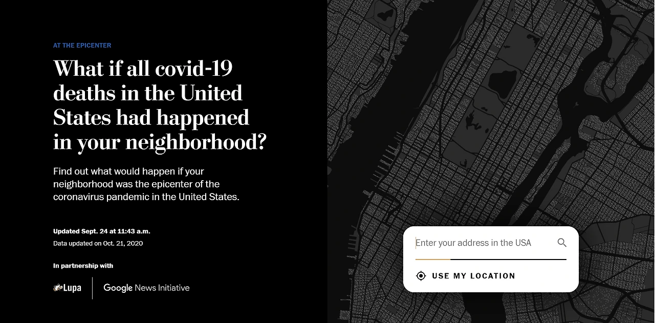 해당 작품은 구글 뉴스 이니셔티브와 브라질 언론 Lupa의 협업물로, 최초 보도는 Lupa에서 브라질 지역을 기반으로 만들어졌다. 보다 익숙한 워싱턴 포스트의 영어 기사로 살펴본 원리는 이러하다. 미국 내 지역을 하나 입력하면 (미국 내 거주자는 본인 위치를 연동해 사용할 수 있다) 회색 점으로 유저 주변의 이웃들이 모두 코로나 바이러스로 인해 사망했다고 가정했을 때의 분포를 보여준다. 간단한 가정이지만 그 충격은 실로 명징했다. mapbox를 활용해 지도의 scale을 자유자재로 다루며 물 흐르듯 스토리텔링을 했다는 점이 인상적이었다.