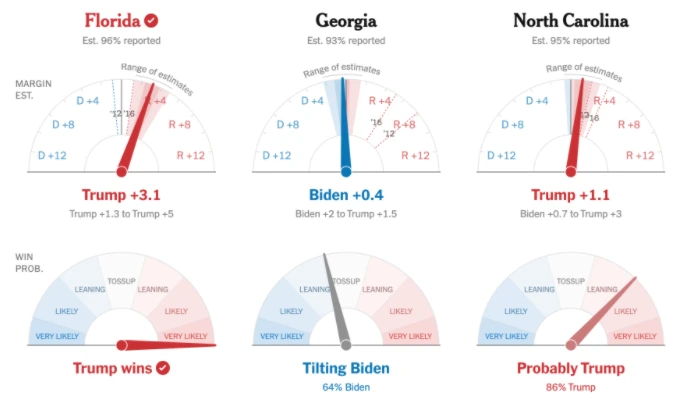 또한 올해의 변수 선거의 가장 큰 변수는 우편 투표를 비롯한 사전투표다. 어느 선거 때보다 사전투표 비율이 높았고 주별로 개표방식도 달랐기 때문에, 결과 예측에 신중을 기했어야했다. 뉴욕타임즈는 '니들'을 활용해 격전지의 당선가능성을 보여주었다. 주목해야할 부분은 오차범위를 표현한 음영으로, 결과를 속단하지 않게 해주었다. 가령, '현재 니들이 A후보를 향하고 있지만 B후보가 당선될 가능성도 충분히 있구나'라고 생각하게 도와준 것이다.