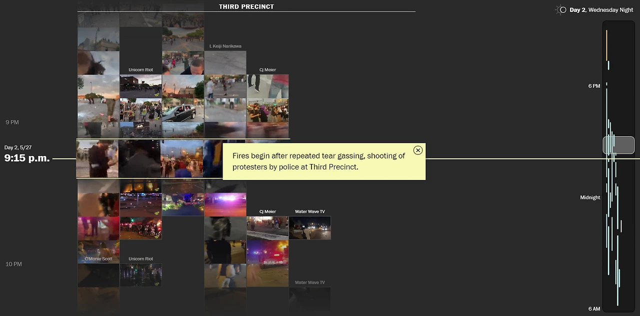 두 번째 기사는 조지 플루이드의 죽음 이후 미니애폴리스에서 진행된 7일간의 시위를 당시 시민들이 찍은 라이브 영상으로 재구성한 기사다. Pudding과 협업한 결과물로, 페이스북, 유튜브 등에 올라온 라이브 영상을 모아 시간대별, 지역별, 채널별로 재구성했다. 오른쪽에 현재 스크롤 구간을 알아볼 수 있는 화면을 작게 제공해 전체 현황을 참조하기에도 좋았다.