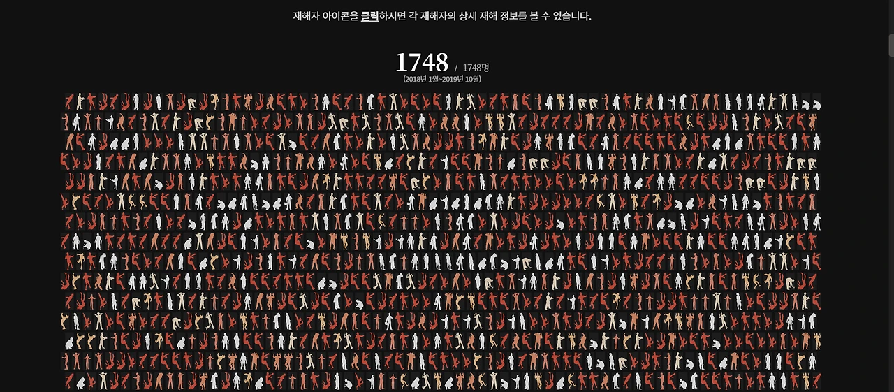 Scrolly telling을 활용해 1748명의 사람 아이콘들이 떨어지는 효과를 주었다. 화면을 가득 채운 사망 노동자들의 아이콘 하나하나를 클릭하면 데이터를 확인할 수 있으며, 사고유형, 업종, 휴일, 연령대 등에 따라서도 분류해 볼 수 있다. 또한 히트맵으로 날짜별 사망 빈도를 시각화하고, 원청회사별, 추락높이별 빈도로 사고를 분류하는 등 다양한 각도에서 산재를 조명했다.