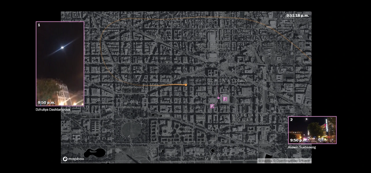 첫 번째 기사는 시위 현장에 헬리콥터가 등장해 굉장히 낮게 날아 태풍급의 바람을 일으킨 사건을 재구성한 기사다. Mapbox 항공뷰 맵 위에 헬리콥터로 대표되는 점의 경로를 시간대별로 시각화했고, 움직이는 경로에 따라 실제 사건 현장에서 시민들이 찍은 영상을 보여주었다.