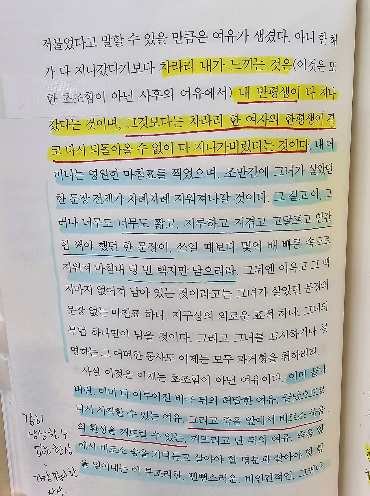 책 속의 한 구절이 가슴을 애이게 만든다.늘 두려웠듯이 언젠가 엄마를 영영 놓칠 것 같은 생각이 들면 아찔해진다. 엄마의 많은 날들이 백지장으로 변해버리기 전에 까만 글씨를 한 자라도 더 새겨본다. 엄마와 통화를 시작하면 기본이 30분이다. 일하면서 통화하기에 가끔 버겁거나 지루하기도 했었는데 어느 순간부터는 통화할 때마다 녹음을 해두기 시작했다. 그 이야기들이 어떻게 될지는 아직 모르지만 엄마의 모든 이야기는 내게 소중한 유산이 될 것 같다.