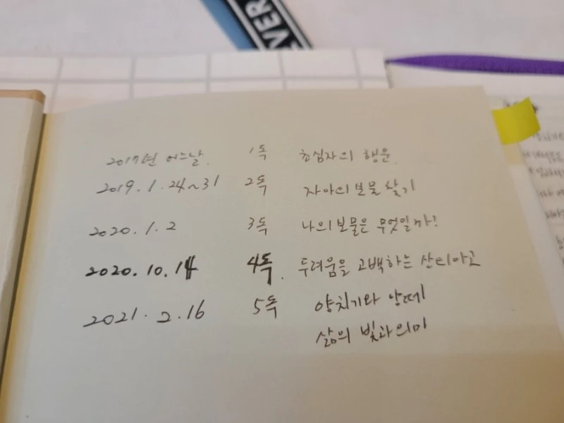 두 번째 읽었을 때, 자아의 보물 찾기에 집중하는 나를 보았다. 마흔이라는 나이를 넘어서고 보니, 진정한 보물에 더 목말랐던 것 같다. 내 보물을 발견하고 싶은 마음. 그렇게 앞으로 무엇을 위해 살 것인지에 대한 고민이 시작되었다.읽고 쓰는 삶이 되고 싶었다.내가 되고자 하는 첫 걸음이었던 것 같다.