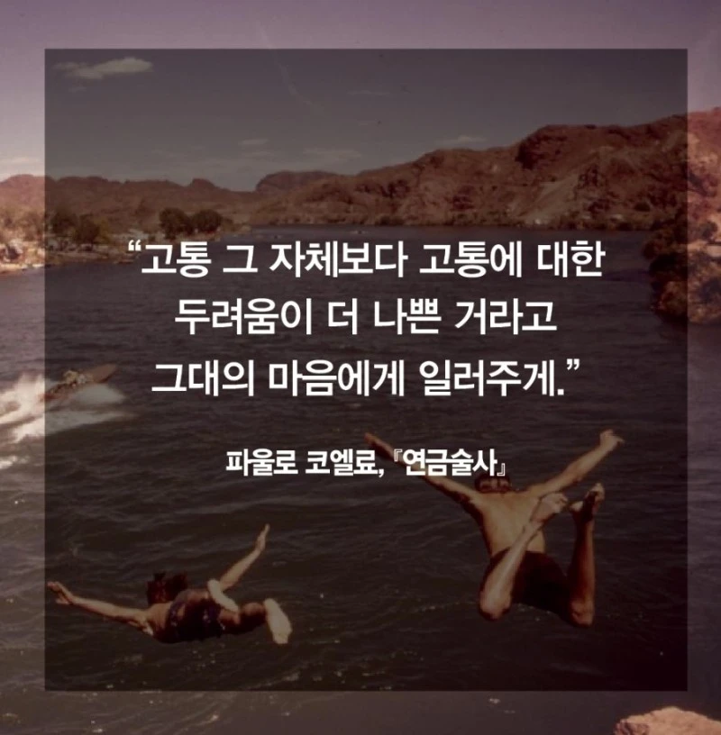 네 번째 읽었을 때, 산티아고가 연금술사에게 자신의 두려움을 고백하는 것에서 나를 동일시했다. 나를 떠나지 못하게 하는 것은 나 자신 말고는 아무것도 없었다.두려움으로 스스로 만든 벽이 얼마나 두꺼워져 있는지 그제야 알았다. 언제든 열기만 하면 되는 가벼운 울타리인줄 알았는데 쉽게 허물수 없는 콘크리트 벽이 되어 자꾸만 나자신을 안에 가두는 나를 수없이 확인했다. 산티아고는 연금술사 앞에서 고백한다. "저는 두렵습니다."