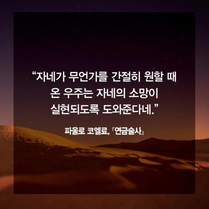 이전의 내 삶은 늘 같은 패턴이었다. 마치 책 속의 크리스털 가게 주인과 같았던 내 모습이다. 10년을 이어오고 있던 자영업으로 세 식구가 근근이 먹고살았다. 부족해도 오늘에 감사하는 것이 미덕인 줄 알았다.꿈이 없지는 않았지만 꿈을 이루려는 생각이 없었다. 도전과는 거리가 먼 채로 울타리 안에서만 살았다. 결혼을 하고 아이를 낳고 먹고살기 위해 매일 일을 하지만 의욕도 없었고 보람도 없던 시기다. 무엇을 더 해야 하는지 전혀 모르던 때이기도 하다.연금술사를 읽기 전의 나는 모든 일에 별 의미를 두지 않았었고 하루하루 그저 흘러가는 시간을 살았던 것 같다. 내가 보살펴야 할 양들을 데리고 먹을 것이 있고 안전한 곳들만 찾아다녔다.