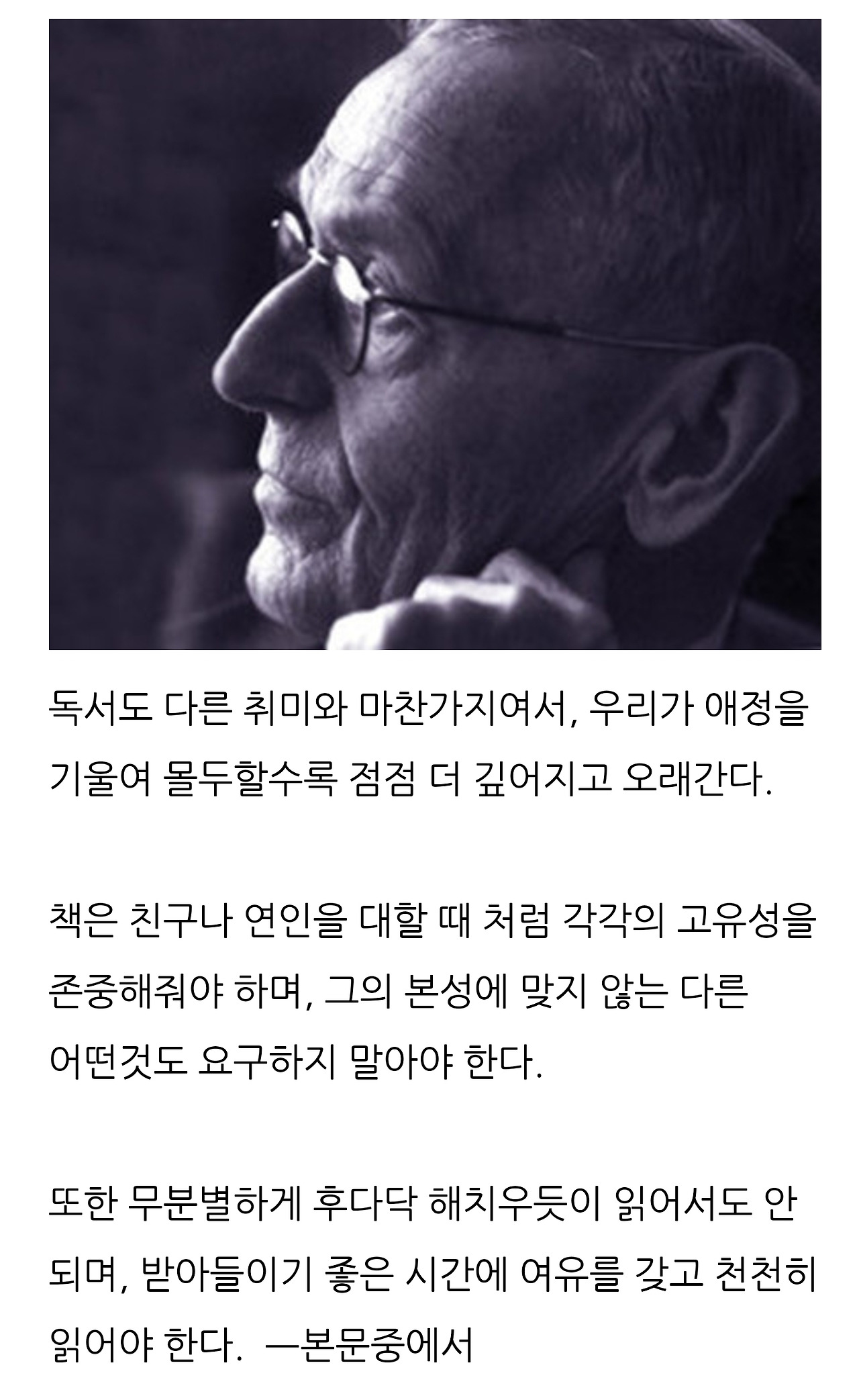 헤세는 무의미한 다독과 뜻 없는 글쓰기를 걱정한다. 시간 때우기나 기분전환을 위한 교양의 독서가 아니라 감동받고 자신의 경험과 인식을 조금이라도 확장해 주는 독서여야 한다고 말한다. 독서에 들이는 시간도 일만큼이나 신중하고 체계 있게 이득을 따져가며 읽어야 한다. 내가 가장 뜨거워지는 시간에 대해 헤세는 알고 있다. 독서를 통해 불꽃같은 에너지와 젊음을 맛본다는 것을 알고 있다. 독서를 통해 나를 재발견해 간다는 것을 알고 있다. 책으로의 도피가 아니라 우리의 삶을 더 단단히 부여잡기 위한 독서여야 한다고 헤세가 말하고 있다.