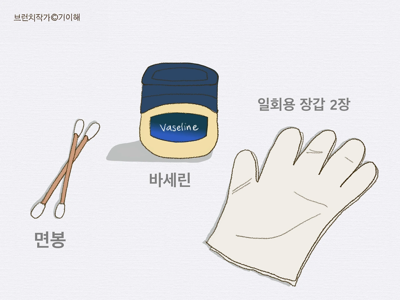 잠들기 전 준비물: 면봉, 바세린, 일회용 장갑 2장