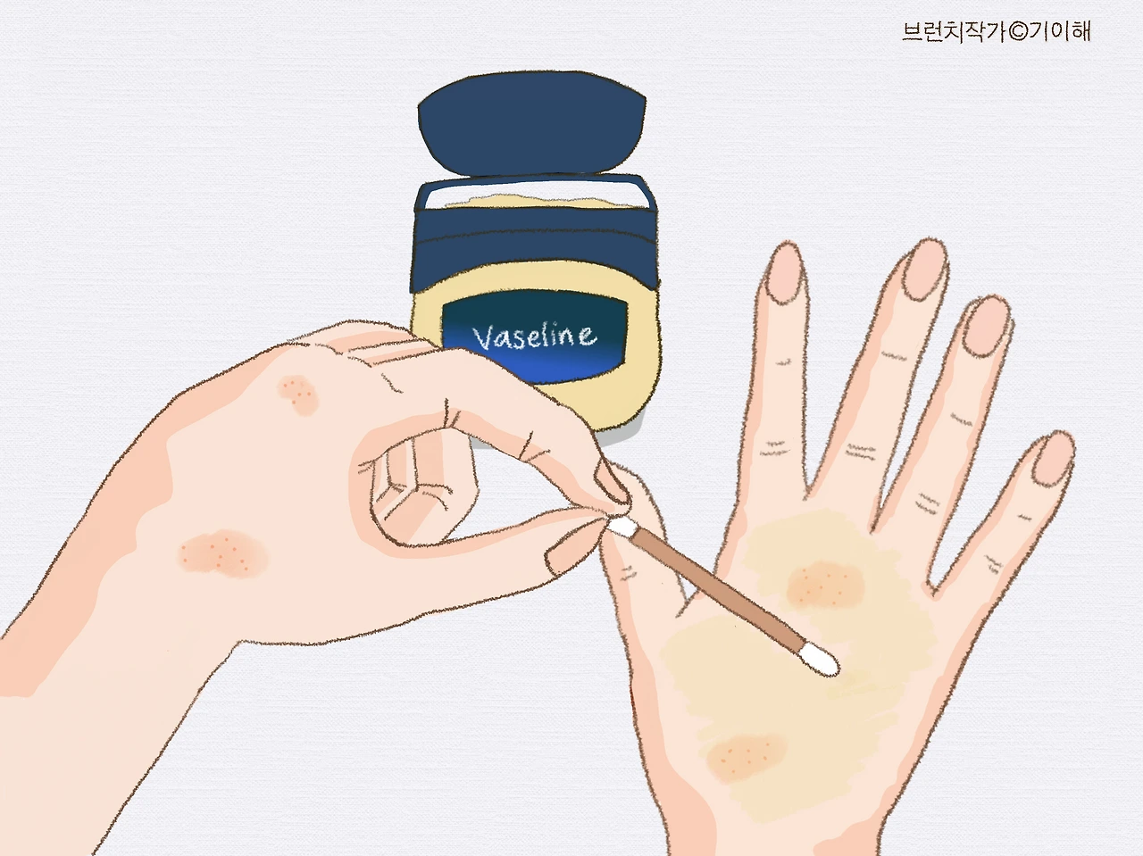 바세린이 묻어있는 면봉으로 손등을 문지른다