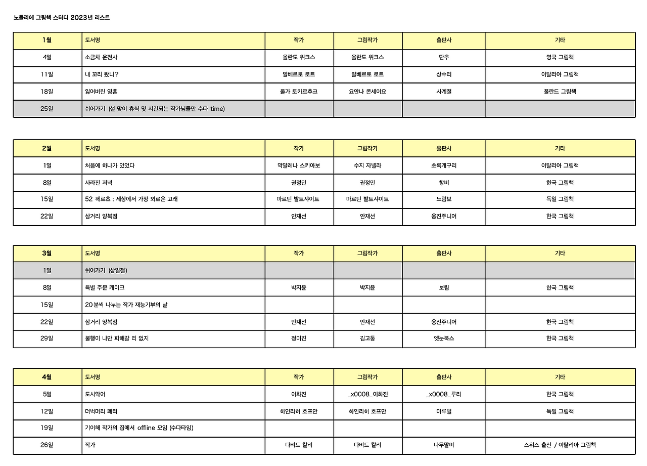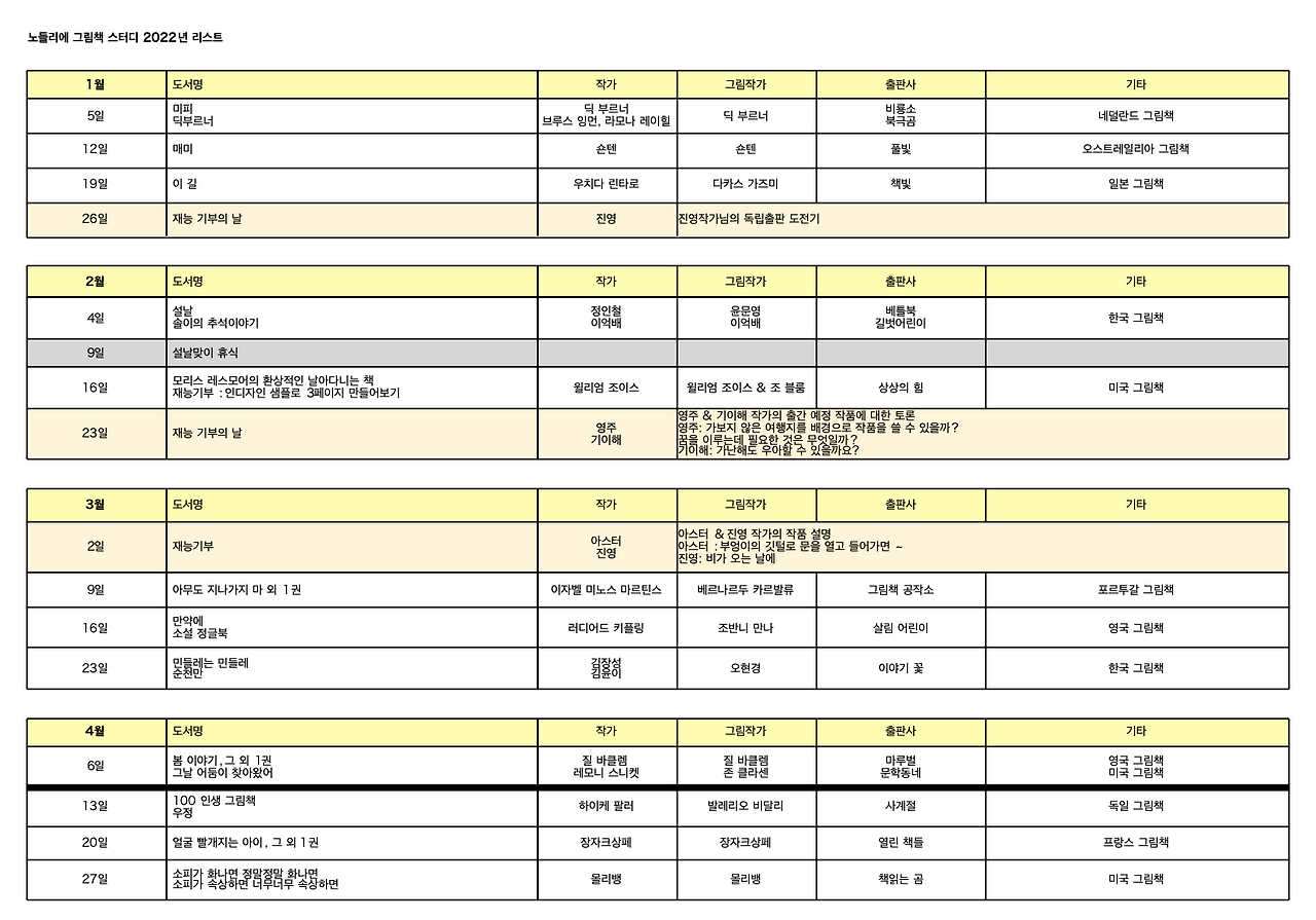 수요일 저녁 8시면 함께 온라인 혹은 오프라인으로 모여서 그림책 스터디에 참석해 주셔서 우리만의 즐거운 추억을 만들게 해 주신 노들리에 작가님들 정말 고맙고 사랑합니다. 각자의 스케줄로 바빠져 여기에서 우리의 한 챕터를 종료하고 우리는 각자의 자리에서 조금 더 성장하여 만나겠습니다.