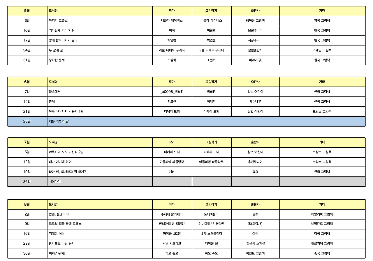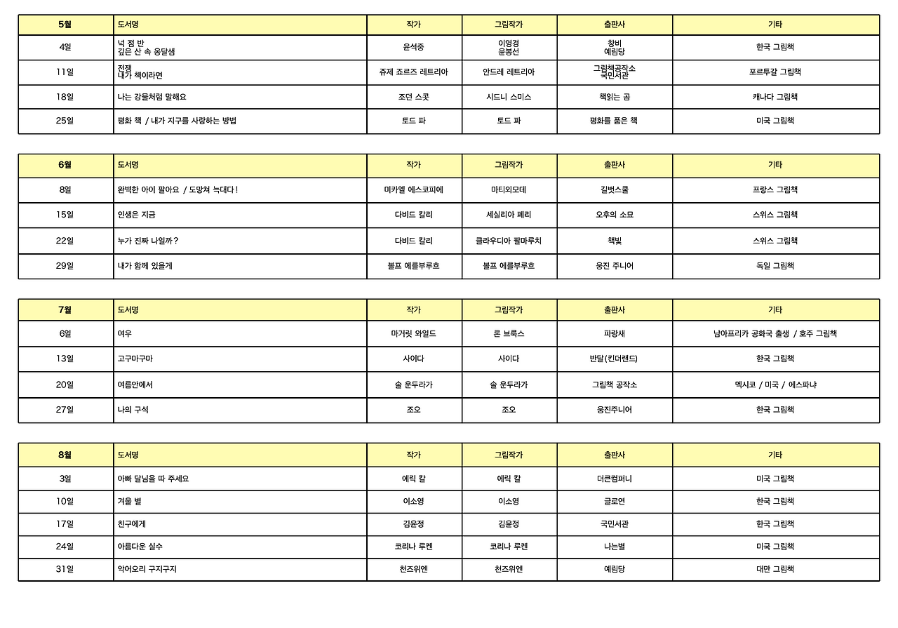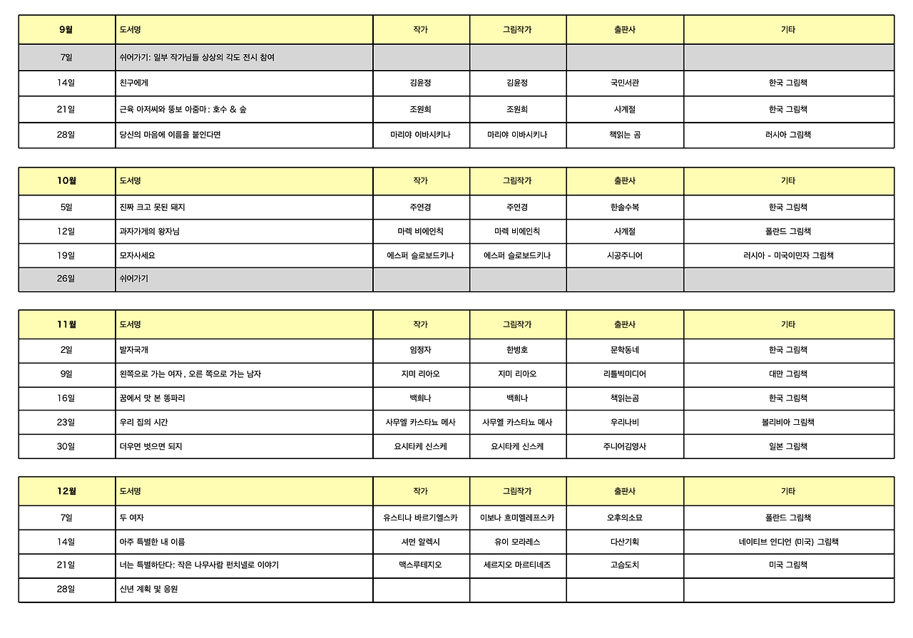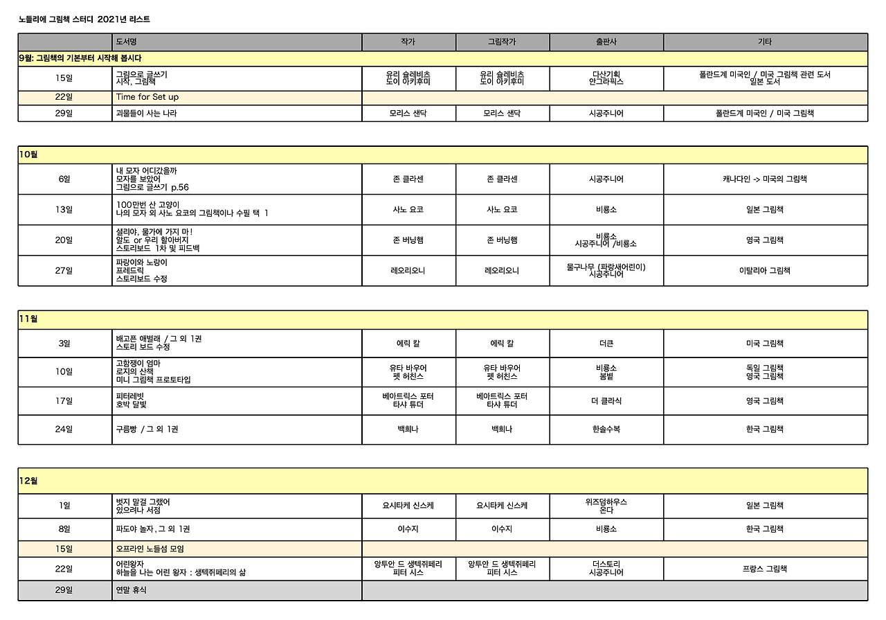 그동안 저희가 스터디했던 그림책의 기록을 올려봅니다. 2021년 9월 둘째 주에 스터디를 처음 시작하여 2023년 9월 6일에 한 챕터를 종료하였습니다. 2년간 우리가 스터디 한 그림책의 목록들입니다.