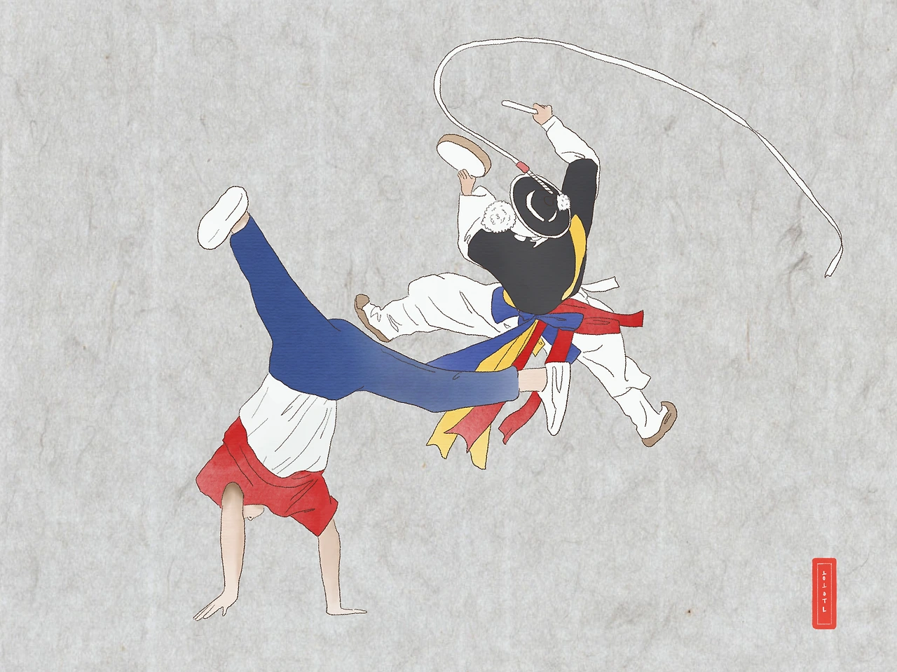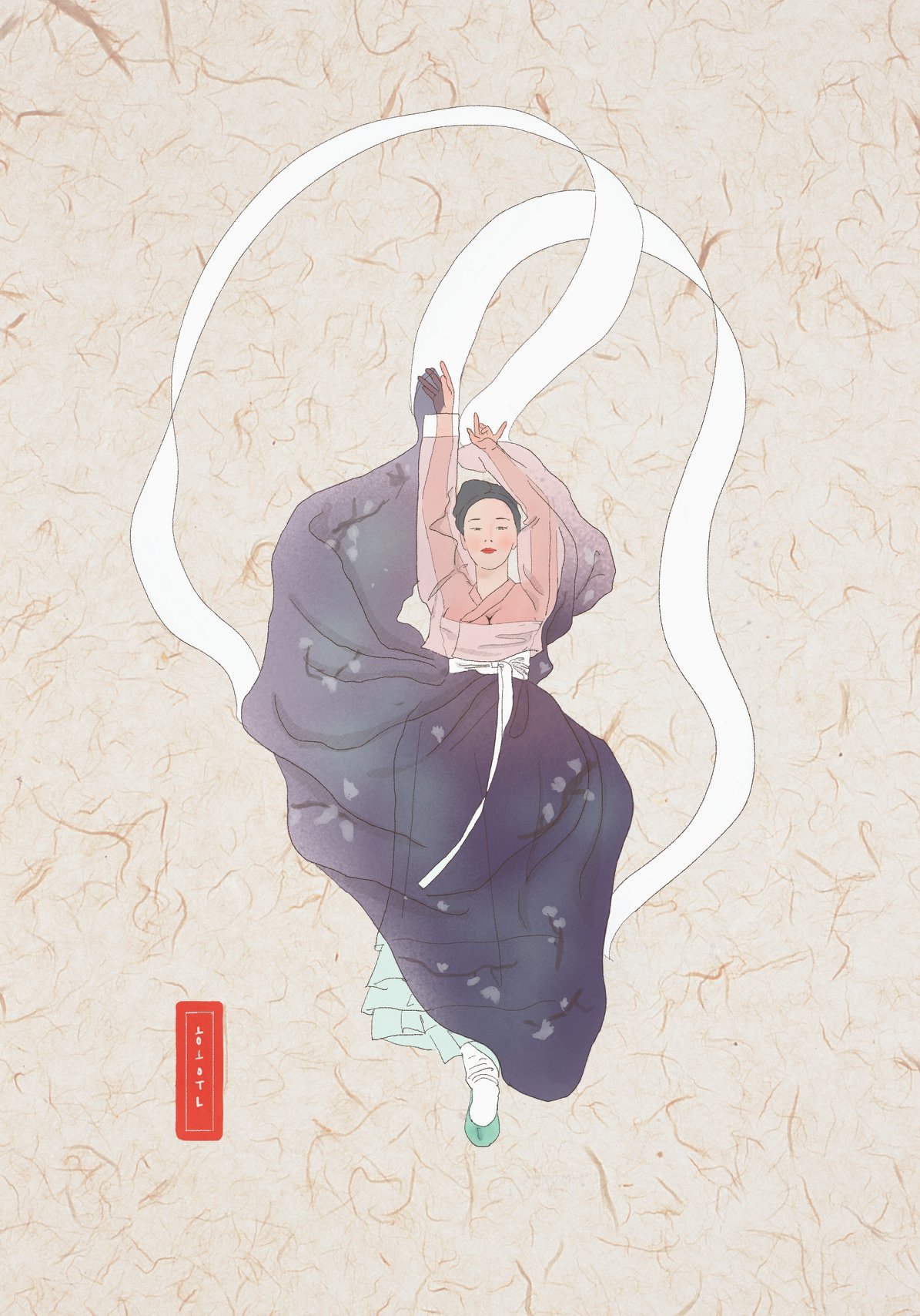 살풀이의 '살'은 나쁜 기운을 의미합니다. 이 춤은 남편을 먼저 보낸 과부들이 마음의 평화를 찾기 위해 추었던 춤 이기도 하고 우리나라 민속 무용의 한 장르입니다. 이 그림은 드라마 '육룡이 나르샤'에 출연했던 척사광 역의 한예리 배우가 너무 예뻐서 오마주 하며 그렸던 그림이기도 합니다.