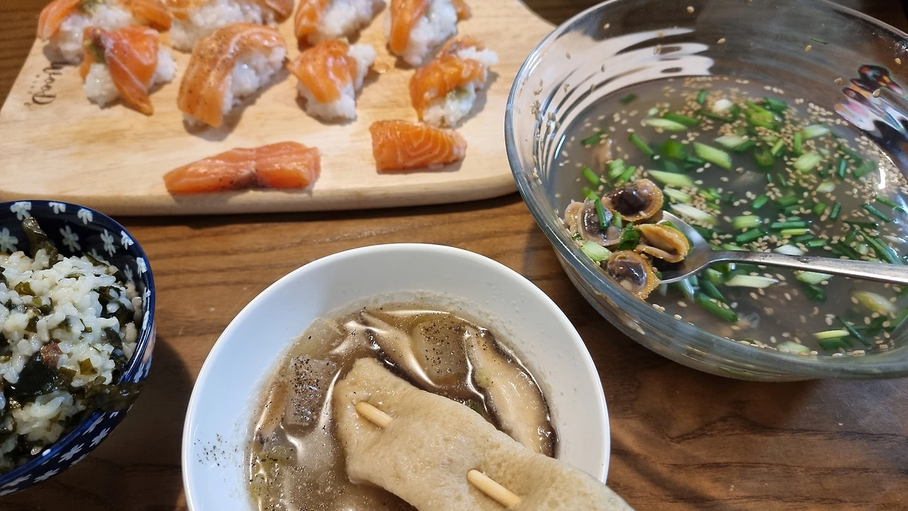 (하은이가 어묵 먹고 싶대서 어묵탕 끓이고, 훈제연어 50% 할인해서 샀던 거 해치우느라 초밥 만들고, 미역국 남아서 버리기 아까워서 미역죽 만들고, 갑자기 파티가 되어버린 밥상.)