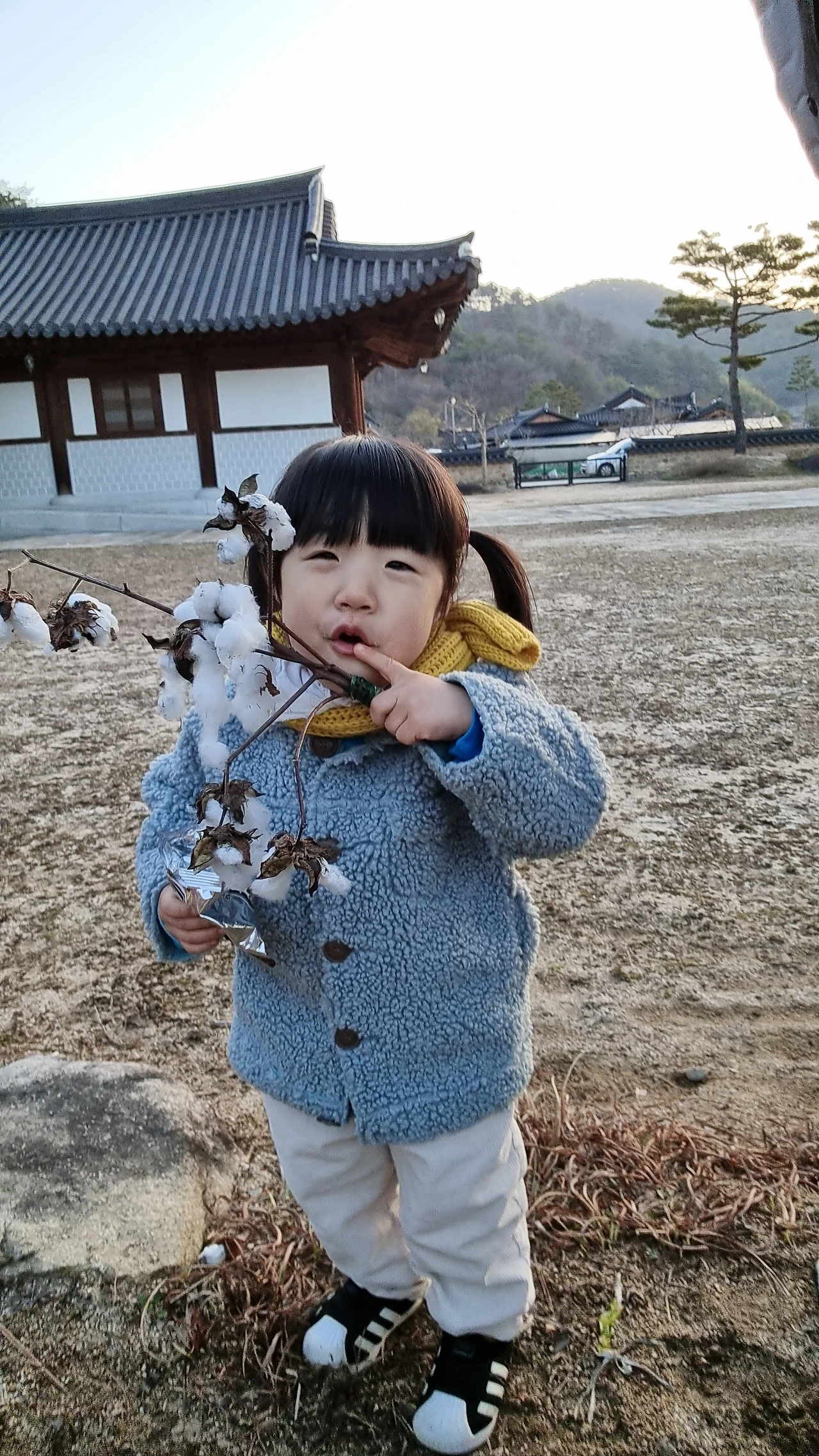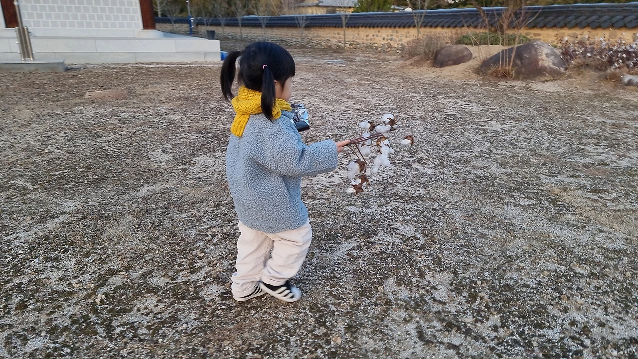 아버지는 오랜만에 같이 찾은 장모님께 목화솜을 드리려고 목화솜 한 다발을 묶어주셨다. 귀여운 얼굴로 자기한테 달라며 손을 쭉 뻗으며 목화솜 다발을 받아 든 하은이가 신나서 뛰어간다. 발 빠른 하은이는 목화솜을 괴롭히며(?) 도망가보지만 나의 큰 걸음으로 성큼성큼 따라가니 독 안에 든 쥐다. 솜사탕을 닮은 목화솜을 입에 넣으려는 하은이를 번쩍 안아 올리며 목화솜 다발을 압수하고 나서야 상황은 모두 종료되었다.