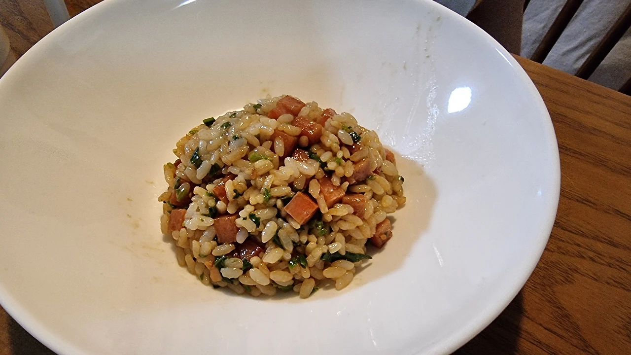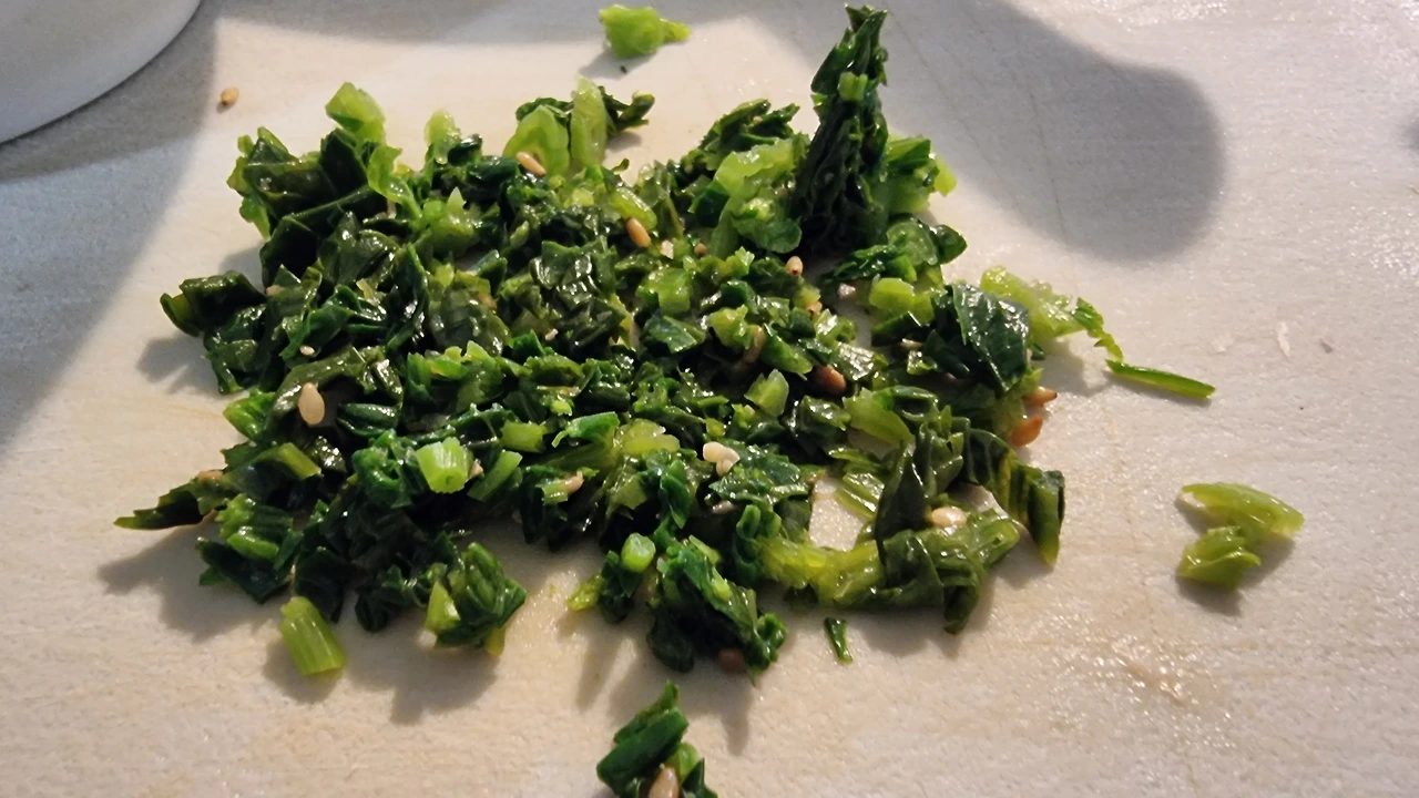 아내가 운동하러 간 사이 작전이 개시되었다. 시금치를 잘게 썰어 먹기 좋게 다듬고, 스팸을 구웠다.
