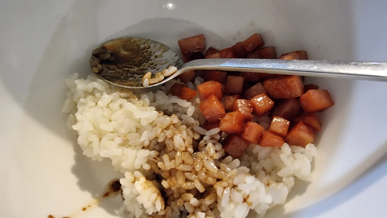 밥을 한 공기 떠서 잘 구워진 스팸과 잘게 다져진 시금치를 넣고, 준비해 둔 양념장을 넣었다. 양념장이래 봤자 간장 한 스푼에 설탕 1/2스푼, 참기름 1/2스푼이 끝이다. 그리고 오늘의 대미를 장식할 마요네즈 한 스푼을 넣고 쓱싹쓱싹 비벼, '보기 좋은 떡이 먹기도 좋다'고 예쁘게 담아 올려 드렸다.