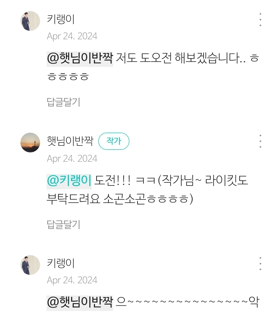 너무 흥분된 나머지 '라이킷'도 잊은채 '댓글'부터 막 들이댔다. 흡사 식당에 들어가 음식은 시켜 먹지도 않고 리뷰를 다는 그런 꼴이라고나 할까. 정신없이 댓글을 쓰고, 한참 지나니. 햇님이반짝 작가님께서 소곤소곤 '無라이킷'을 알려주신다. 정신이 번쩍 든다. (그리고 참고로 안 소곤소곤했다! '으잇?')
