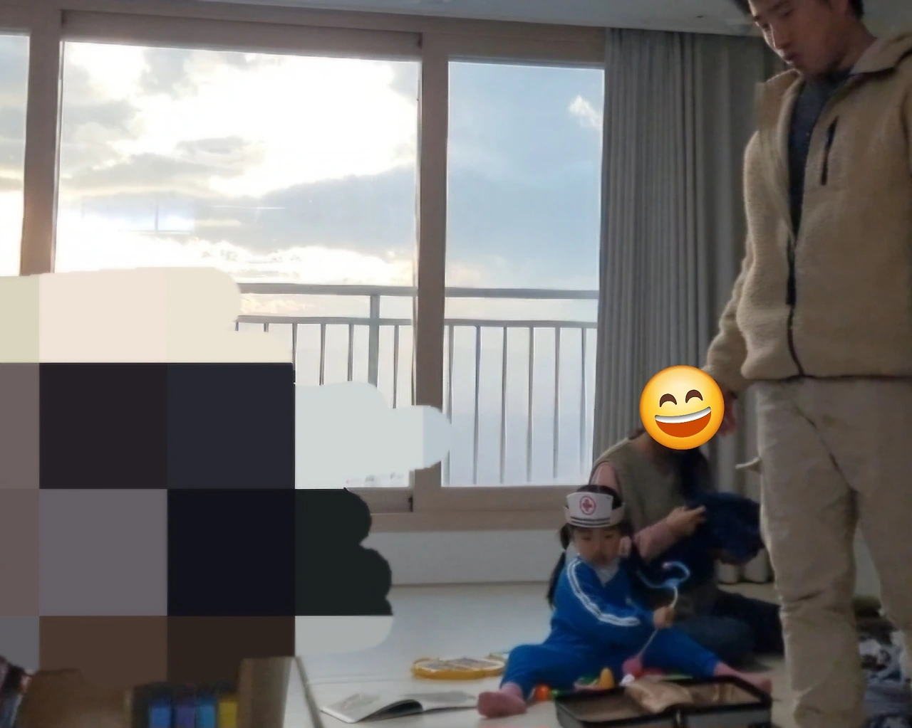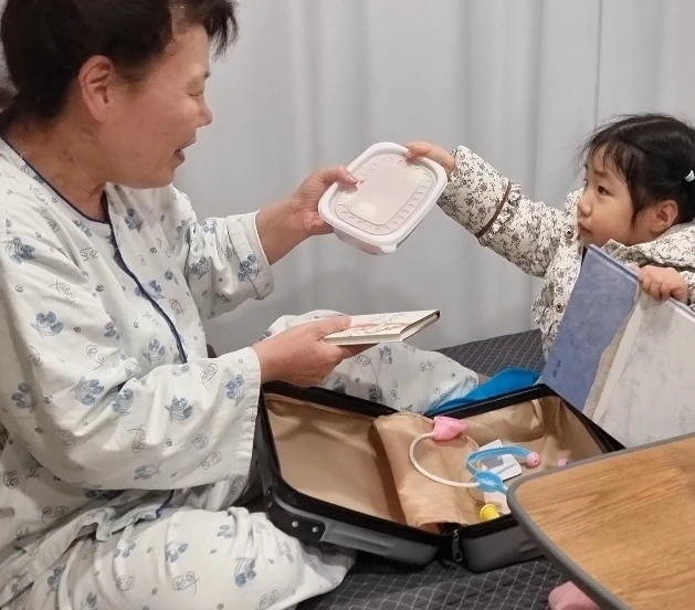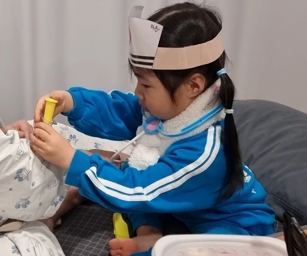 결국 설득에 성공했다. 왕진가방을 내려놓고 열어보니 청진기와 체온계, 주사기까지 제법 그럴듯한 의료장비들이 쏟아져 나왔다. 30초도 안 되는 짧은 진료를 마친 하은이는 곧바로 "책 읽어주세요"를 시전 하며 할머니를 귀엽게 괴롭혔지만, 여전히 우리의 행복보따리 같은 녀석이다.