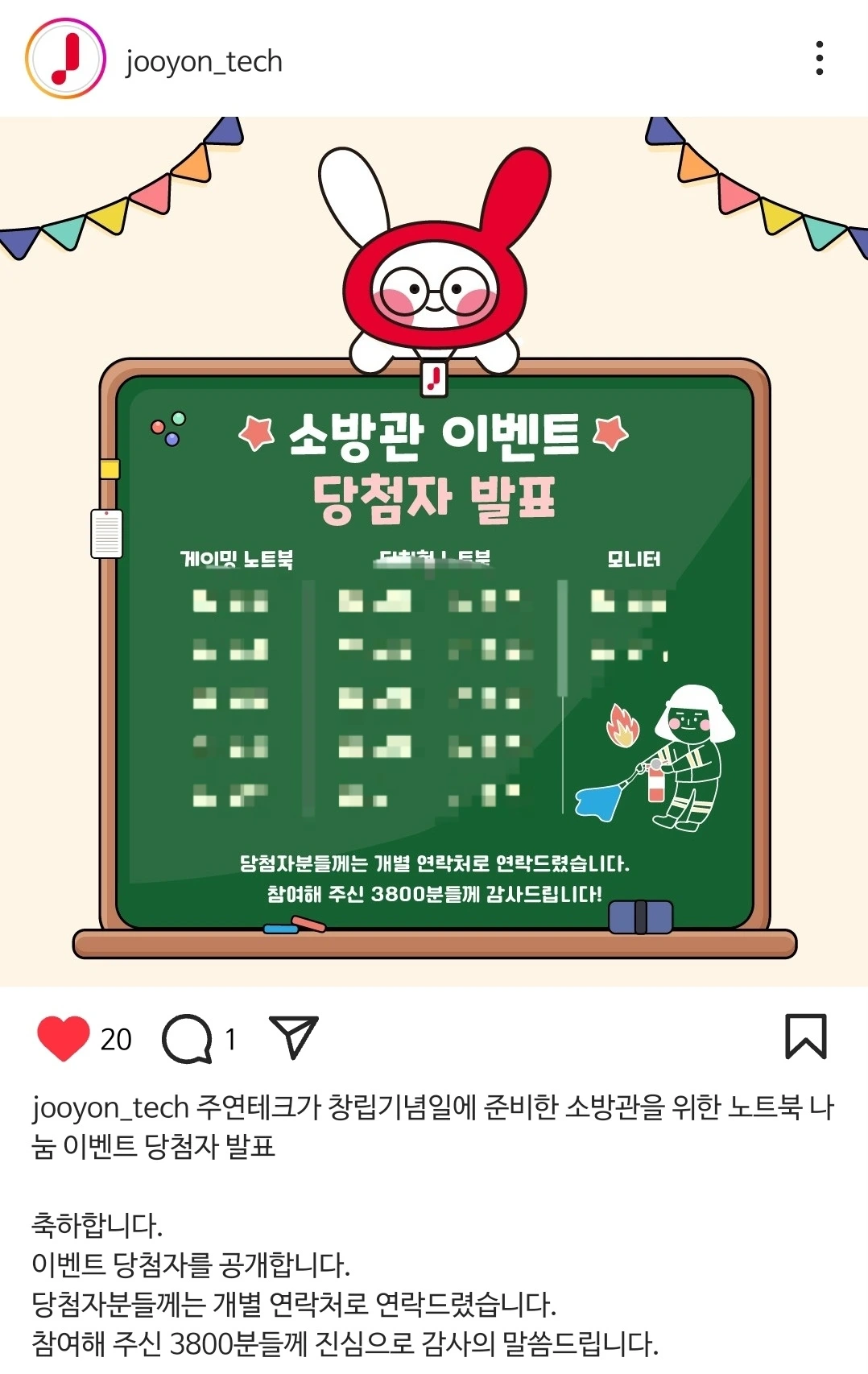하지만 이것은 가히 차원이 다른 기쁨이었다. 몇 주간 주연테크 SNS를 들락날락하며 혹시나 하는 기대에 당첨자 발표 소식을 계속 찾아보았다. 그런데 오늘! 오늘! 발표가 난 것이다!!!