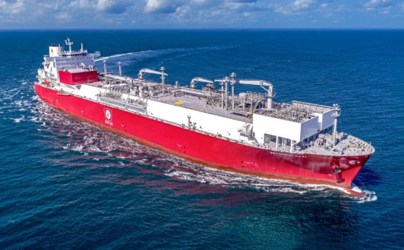 (FSRU, 출처: HD현대중공업, 선박 앞부분에 흰색의 박스 같은 모양 2개가 재기화설비)
