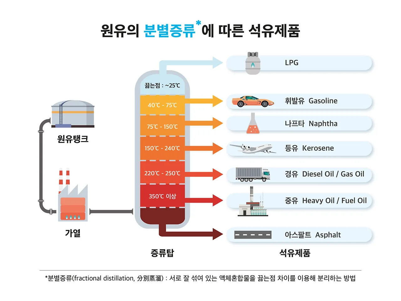 원유를 정유공장에서 끓는점 차이에 따라 분리하면, LPG, 나프타, 등유, 경유, 중유 등 다양한 물질이 나온다.