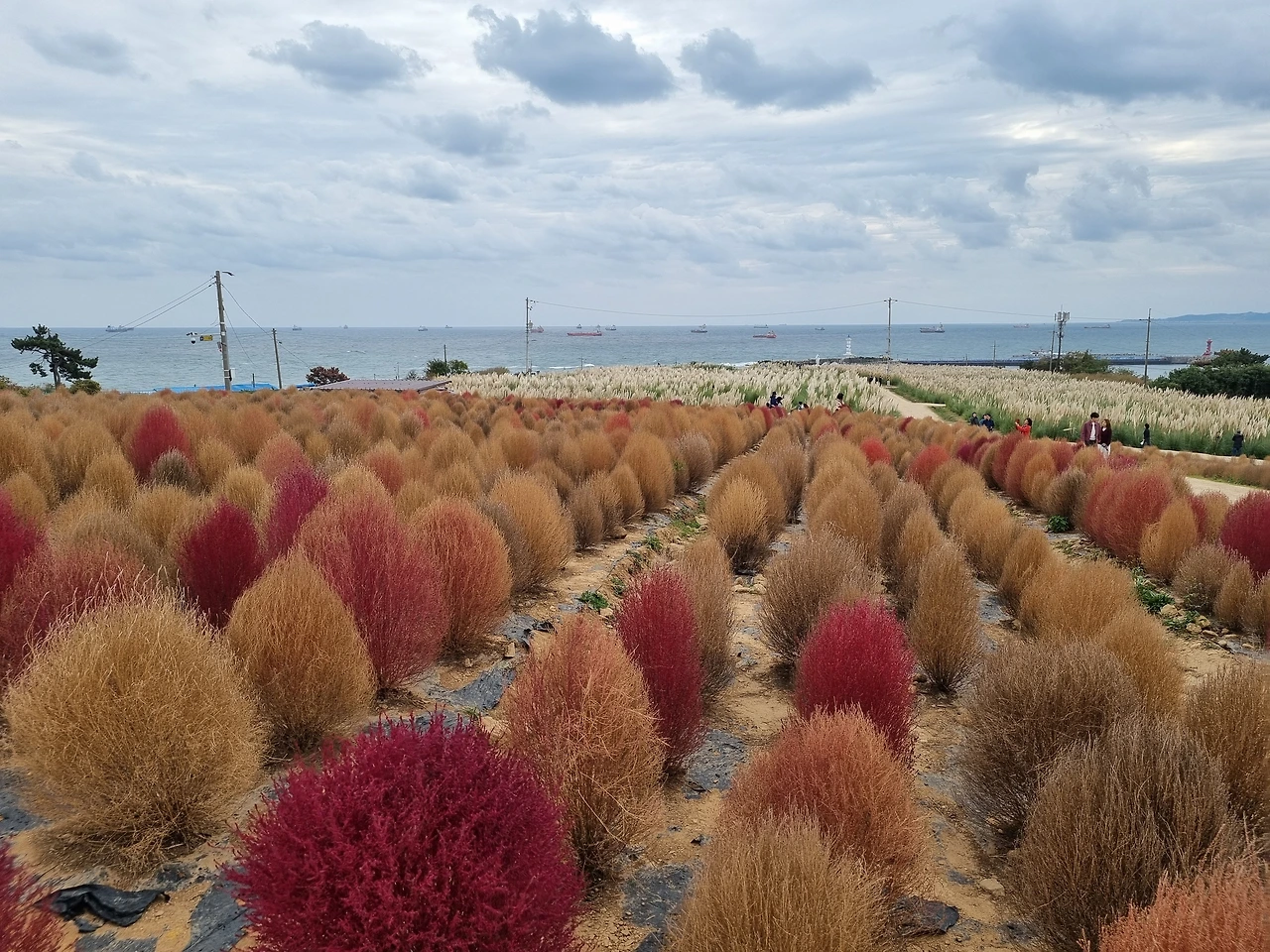 처음 본 댑싸리는 몽글몽글한 모습이었고, 모여 있으니 엠보싱 화장지처럼 올록볼록하게 보였다. 진한 붉음과 연한 붉음(거의 노르스름하다)이 아름답게 뒤섞여 있었다. 글자 그대로 울긋불긋이다. 하늘을 덮고 있는 구름과 화물선들이 떠 있는 바다, 팜파스와 댑싸리 군락이 어우러져 있는 풍경을 우리는 아무 말없이 한동안 바라보았다.